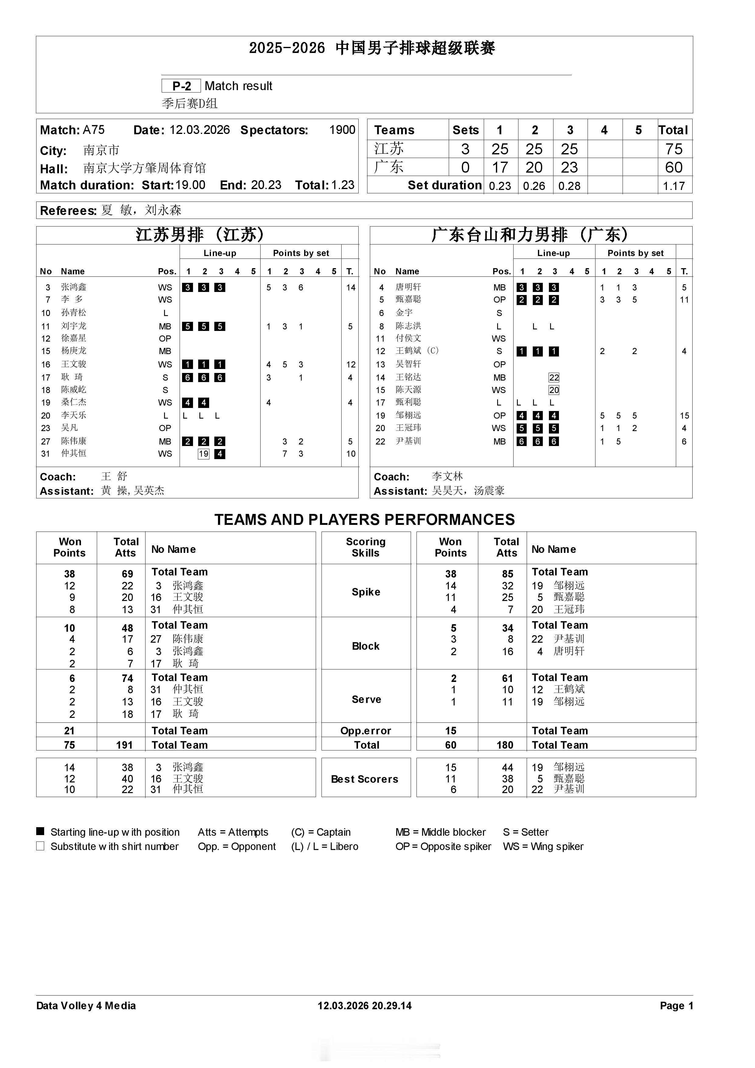 【中国男排超级联赛 江苏3-0广东】3月12日晚,A级季后赛总第19轮,D组的江苏主场3-0(25-17, 25-20, 25-23)完胜广东。张泓鑫14分,王文骏12分,仲其恒10分;邹栩远15分,甄嘉聪11分。