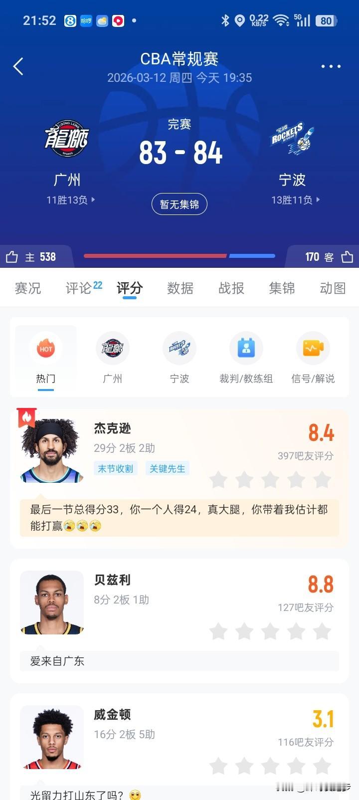 广州被宁波逆转了,剧情跟昨晚的广东真的很像啊! 广州最多领先宁波13分!第四节宁波小外杰克逊自己狂砍24分,帮助球队逆转广州,他厉害了!关键时刻不手软!今年的宁波真的挺猛,今天他其实上半场手感一般,下半场接管比赛!关键时刻他迎着徐昕进那个球太漂亮了,巨星球,差点杀死比赛,不是刘晓宇犯规,这比赛估计早结束了… 广东三支球队这一轮全部输球!要输我们一块输!广东篮球德比 宁波篮球联队 宁波队漏人