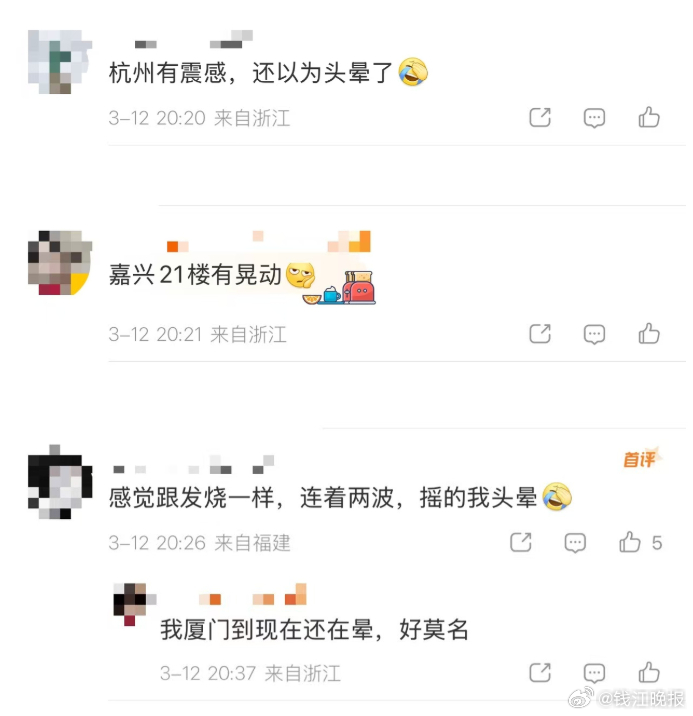 【台湾发生5.3级地震,杭州、嘉兴网友:有震感,“摇得头晕!”】#台湾花莲发生5.3级地震杭州有震感# 中国地震台网正式测定:03月12日20时14分在台湾花莲县(北纬23.78度,东经121.55度)发生5.3级地震,震源深度19千米。#台湾地震# 杭州有网友表示,突然感觉一阵头晕。也有嘉兴网友称有震感,“嘉兴21楼有晃动”。记者在网上看到,有福建福州、厦门等地网友也表示有震感,“连着两波,摇得我头晕。”(潮新闻 记者 金檬、中国地震台网)