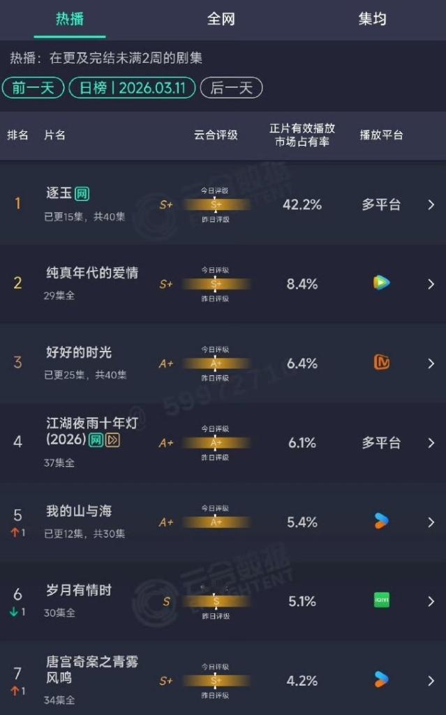 双平台和粉丝硬刚! 《逐玉》双平台热度均破万,云合占比42.2%,播放量8700万,几乎吸干大盘,但是最近一直被质疑注水,甚至被举报,不过爱奇艺这边给出了回应,说数据真实可信,而腾讯这边也疑似回应数据注水,宣传海报写的是“无添加不兑水”。