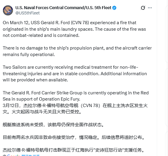 美国海军第五舰队通报,"杰拉尔德·R·福特"号航母(CVN-78)发生舱内火情。3月12日,舰上主洗衣房突发火灾。此次事件与作战行动无关,火势已迅速得到控制。该航母仍保持全面运行状态,事故造成两名水兵受伤。 美伊以冲突 中东局势