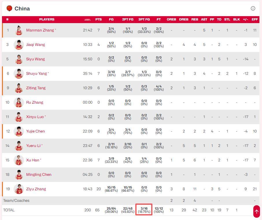 比利时全场3分球35中15,命中率42.8%,中国女篮全场3分球16投3中,命中率18.6%。产量、命中率都被比利时碾压。