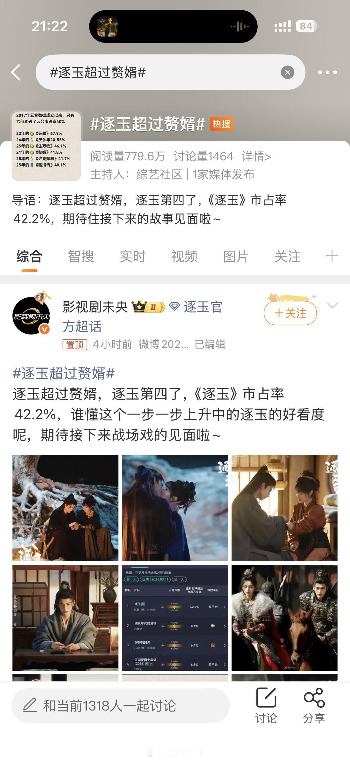 《逐玉》云合42.2%,超过《赘婿》,是近十年来云合破40了的电视剧里的前四了
