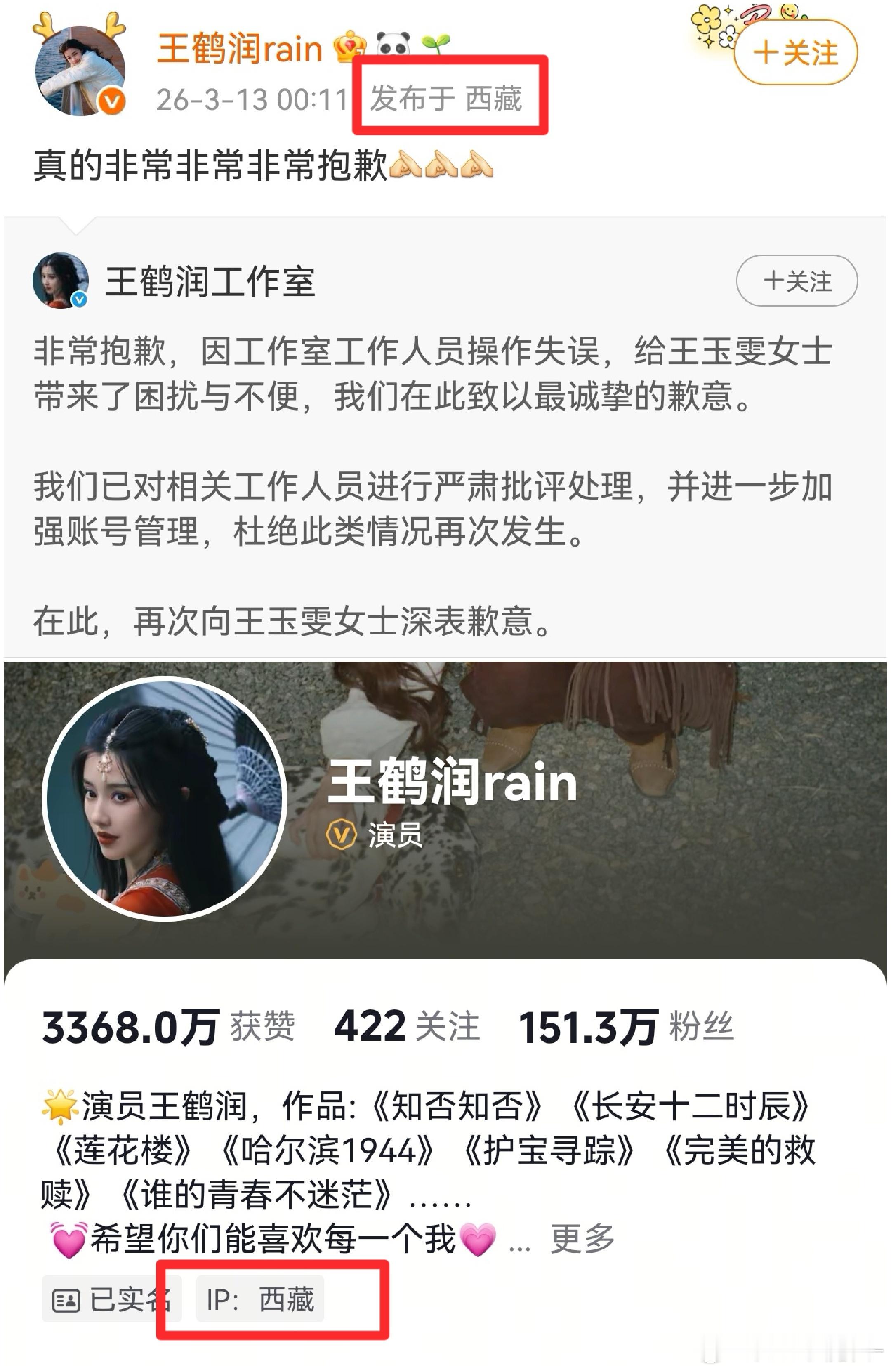 王鹤润王鹤润在西藏破案了,IP上海的确实是工作人员,她本人在西藏录制种地吧, Ip地址也在西藏