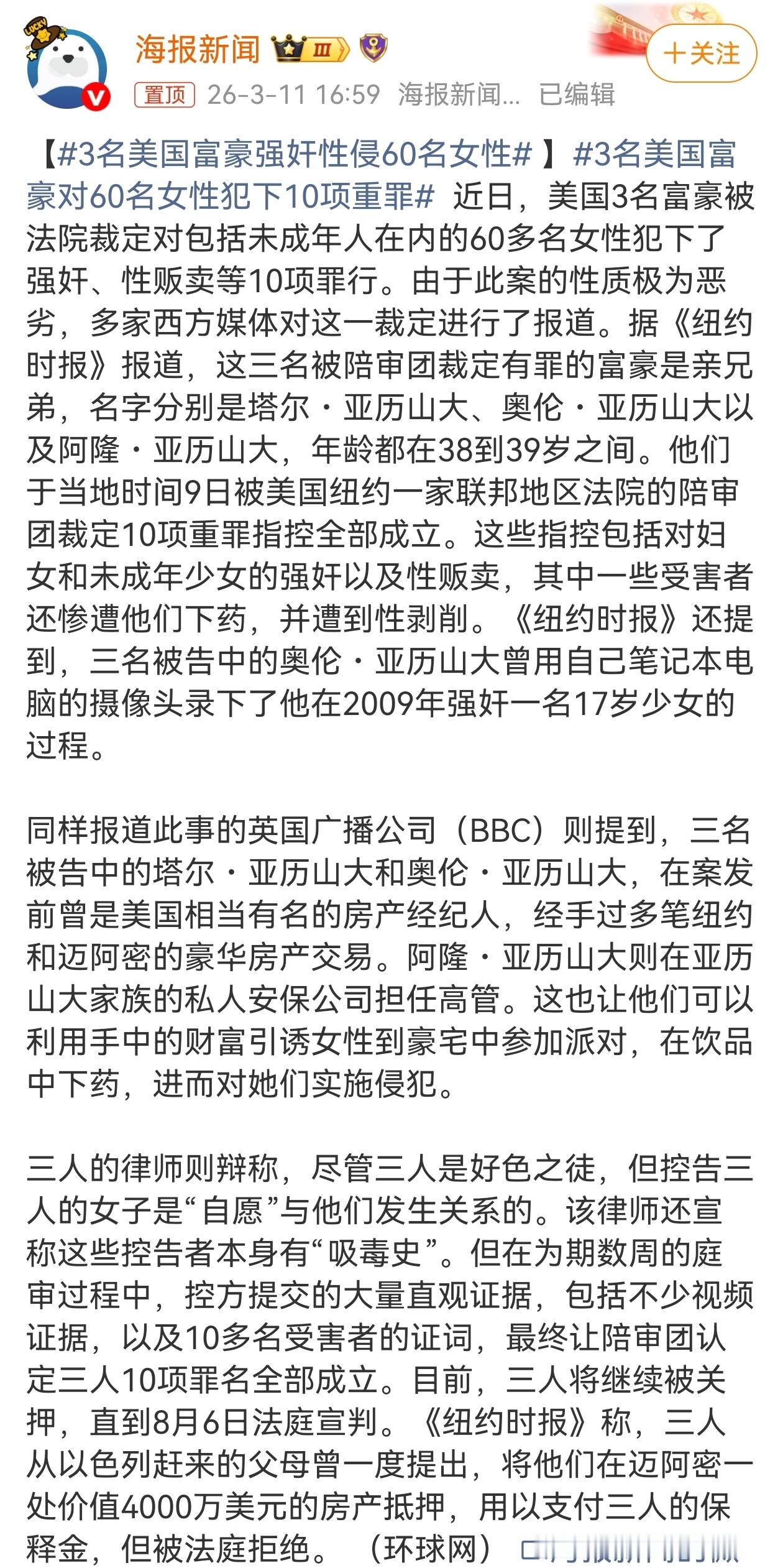 近日,三个美国富豪强奸性侵60名女性,经西方媒体报道后震惊全美,根据美国纽约曼哈顿联邦法院陪审团裁定,亚历山大三兄弟对包括未成年人在内的60多名女性犯下的10项重罪指控全部成立,包括性贩卖、强奸、对未成年人的性剥削等罪行。时事满谈