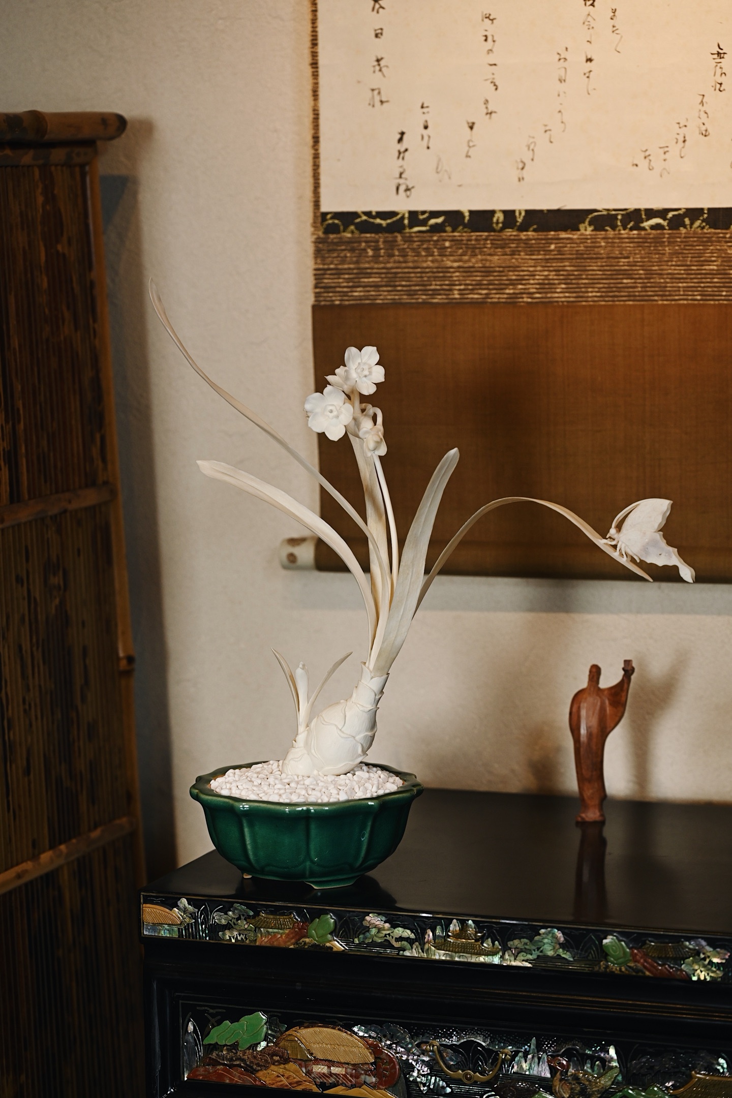 雕工细腻,花叶似坠露凝香,清姿秀逸,蝴蝶翩跹,气韵清灵。案几陈置,风雅脱俗。