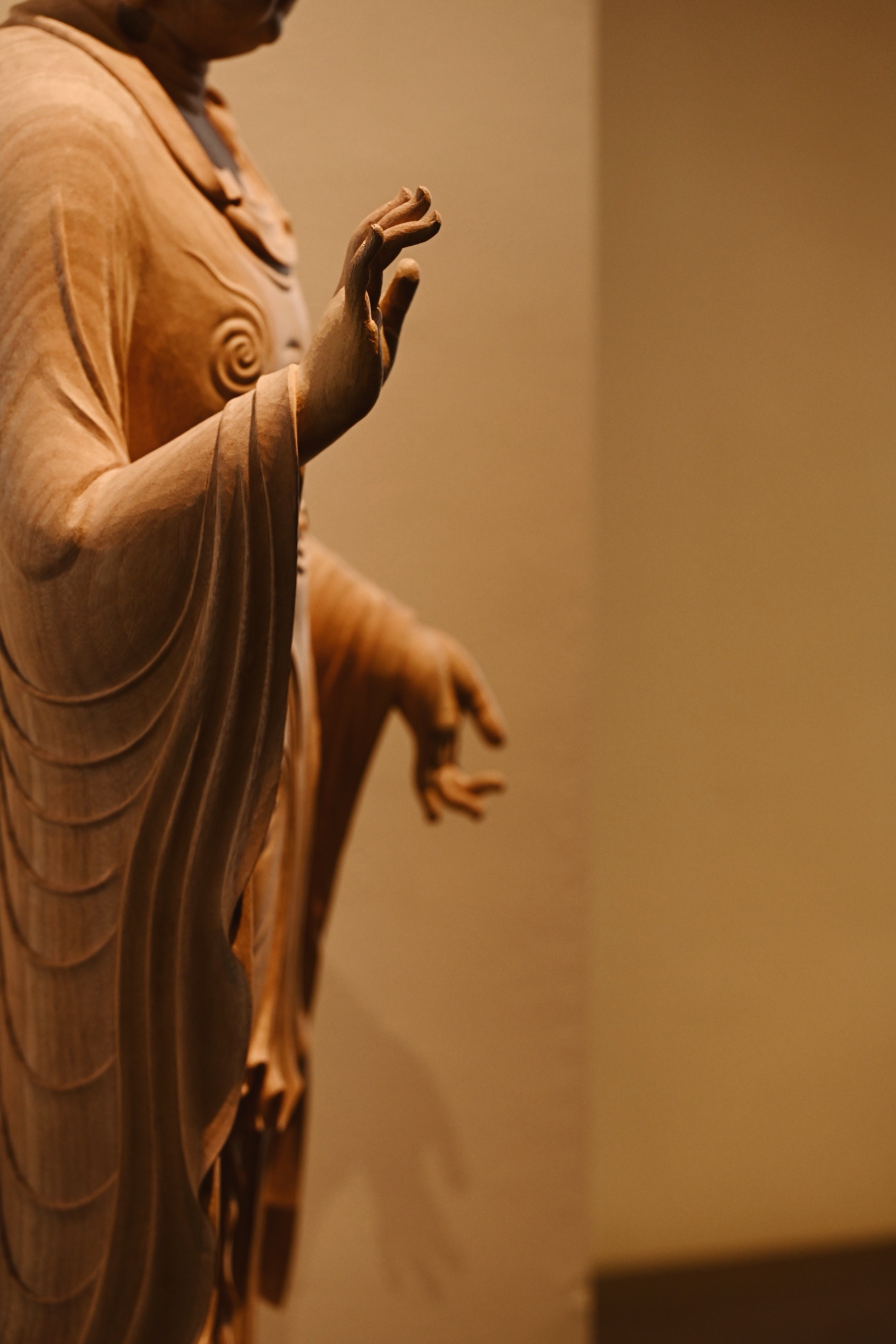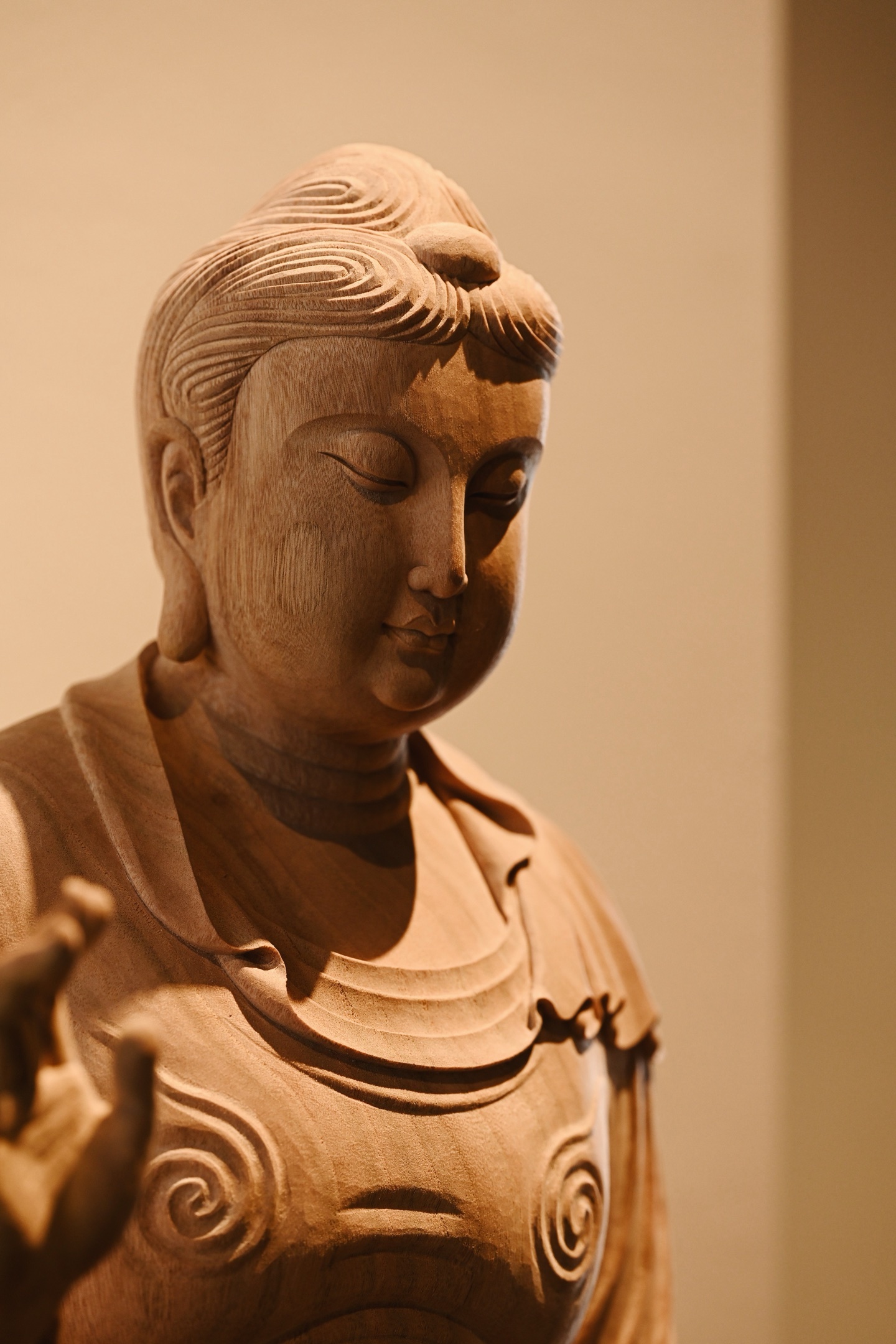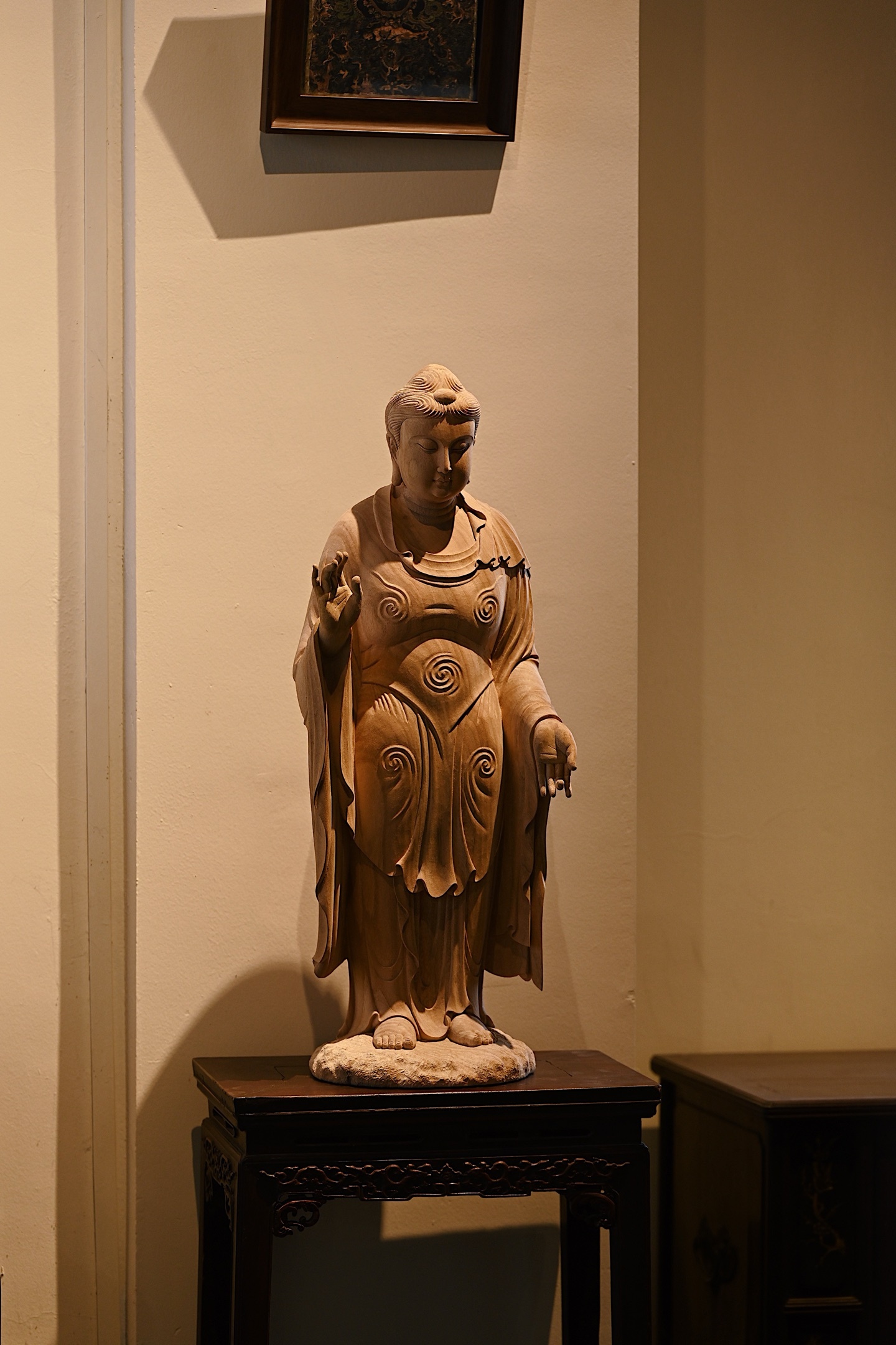 造型古朴典雅,佛像面颊丰润,双目低垂,神情静谧,仿佛在俯视沉思中。衣纹流畅贴体,衣袂垂落如涟漪层叠,极具动感。佛像右手抬起施无畏印,左手自然垂下,姿态庄严。置于书房或客厅,禅蕴深厚。