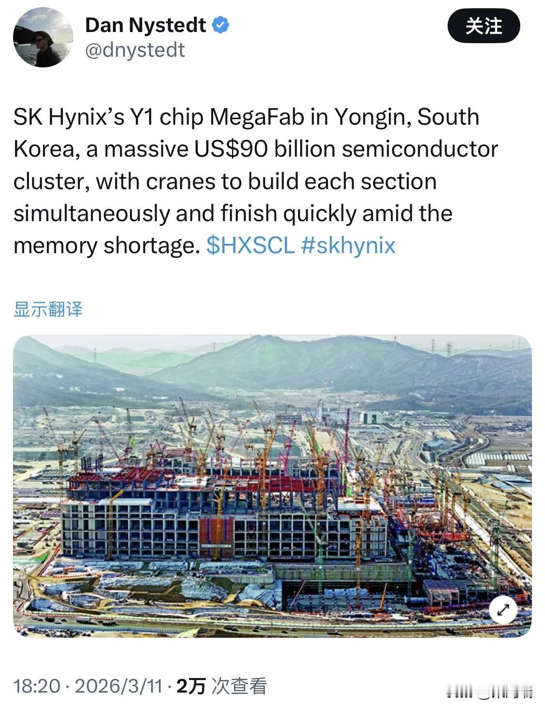 SK海力士在韩国京畿道龙仁市打造的半导体集群确实是一个极具规模的项目。目前该集群已经正式进入实质性的建设和追投阶段。 项目规模与投资:该项目最初公布的总投资额约为 120 万亿韩元(约合 900 多亿美元)。最新的动态显示,SK海力士已于 2026 年 2 月宣布追加 21.6 万亿韩元(约合 151 亿美元)用于首座晶圆厂及相关设施的建设。 首座晶圆厂进度:第一座晶圆厂已于 2025 年 2 月 正式破土动工。其建设将分阶段进行,首座晶圆厂预计将在 2027 年 5 月 竣工并投入运营。 战略定位:该基地被定位为 AI 核心存储芯片——高带宽存储器(HBM) 的重要生产据点。通过提高龙仁工厂的容积率,SK海力士计划将洁净室面积扩大 50% 以上,并引入极紫外光(EUV)光刻设备等尖端设施。 长远规划:SK海力士计划在龙仁集群内共建设 四座晶圆厂。预计到 2030 年首厂全面运营后,SK海力士的 DRAM 月产能将大幅提升,目标是缩小与行业龙头三星电子的差距。 这一庞大的产业集群不仅是 SK海力士历史上的战略性项目,也是韩国打造“全球最大半导体超级集群”计划的核心组成部分。
