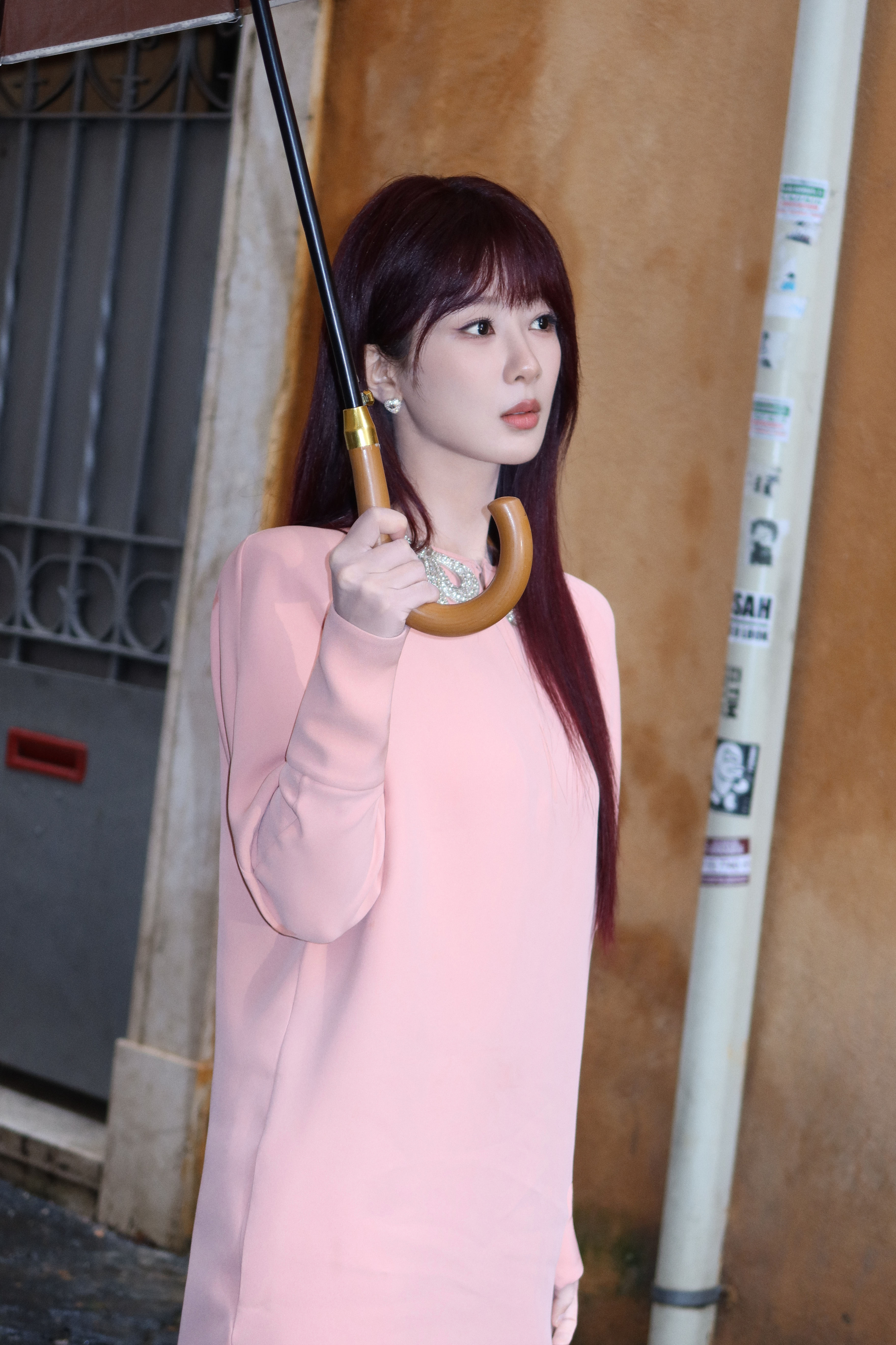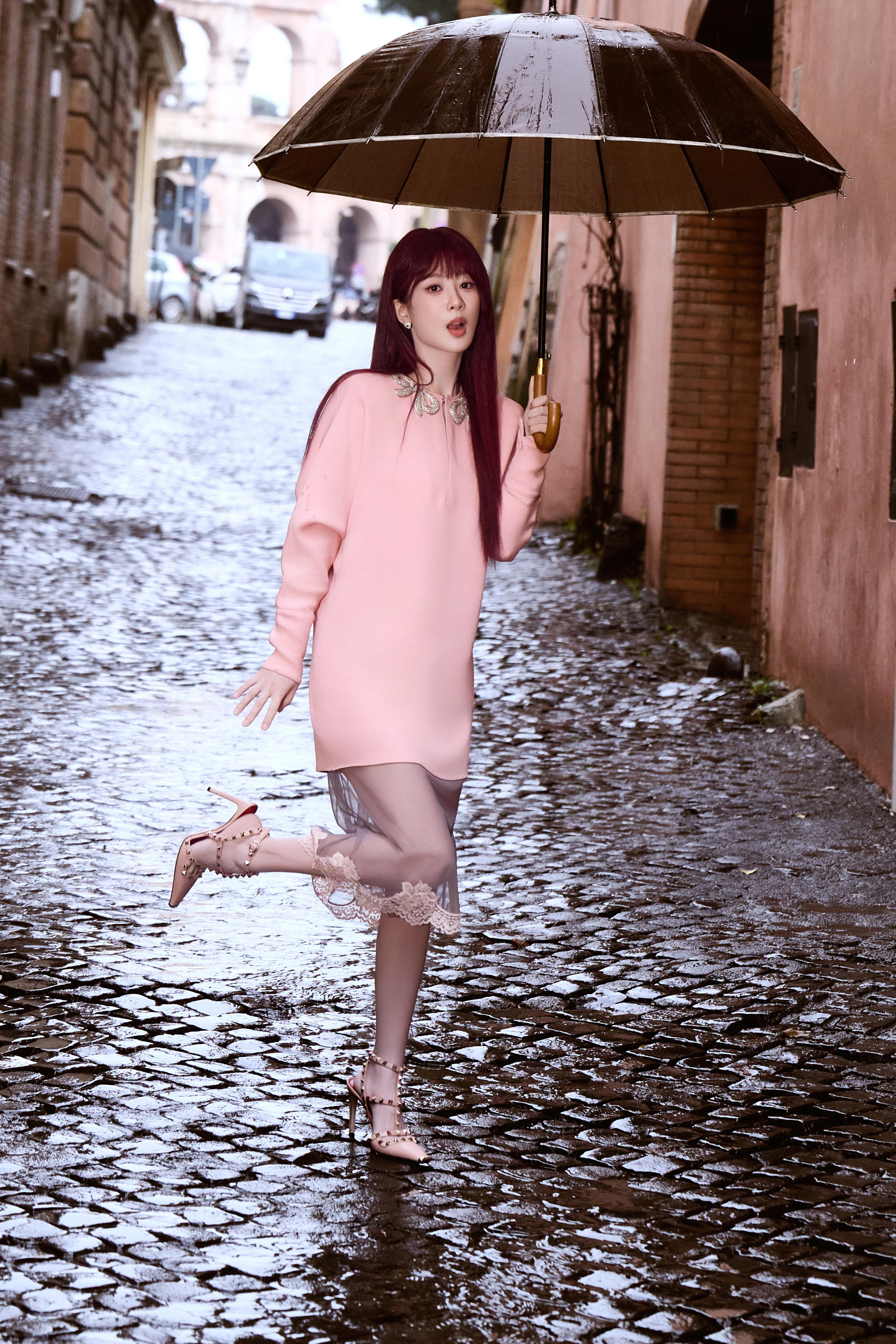 今晚看秀造型图集正式揭晓 !迎来第三次海外看秀之行 ,品牌代言人杨紫身穿 2026 早秋系列粉色连衣裙即将亮相华伦天奴于罗马举行的 2026 秋冬大秀 ,撑伞漫步雨雾中的罗马街头 ,红发粉裙点缀下的 Valentino 女郎惊喜上线 ,共赴新季之约 ~ 💖