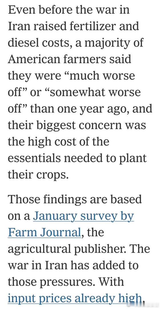 今年一月,美国农协调研,75%认为粮食生产处于“衰退”,多一半认为自己的情况比一年前更糟,主要因为成本太高