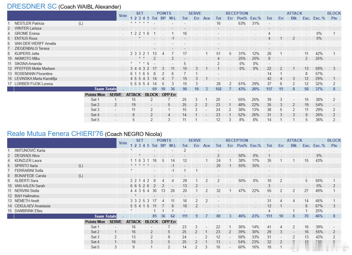 【欧联杯半决赛首回合,基耶里3-2德累斯顿】2025/26赛季欧联杯半决赛首回合,德累斯顿主场2-3不敌基耶里! 25-23 , 26-24 , 14-25 , 14-25 , 10-15世界女排新闻国际排坛动态 内维尼30分(55扣27中2失误2被拦1拦2发,32一传一失误)孔孜勒16分内梅斯16分奥莫鲁伊11分