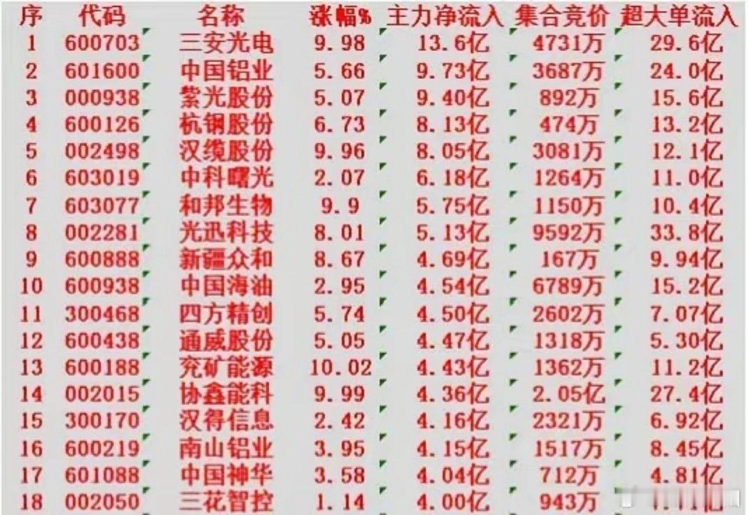 3月12日收盘主力资金流向榜单主力资金净卖出前十个股截至3月12日收盘,主力资金净卖出居前的个股名单如下,净流出金额均处于高位:1. 华工科技:主力净流入-26.2亿元2. 中国能建:主力净流入-23.2亿元3. 新易盛:主力净流入-21.6亿元4. 华胜天成:主力净流入-17.7亿元5. 佰维存储:主力净流入-16.1亿元6. 中际旭创:主力净流入-13.0亿元7. 航天发展:主力净流入-10.5亿元8. 紫金矿业:主力净流入-9.68亿元9. 芯原股份:主力净流入-9.15亿元10. 蓝色光标:主力净流入-8.33亿元主力资金净买入二十个股截至3月12日收盘,主力资金净买入个股榜单出炉,多只标的获资金大幅加仓:1. 三安光电:主力净流入13.6亿元2. 中国铝业:主力净流入9.73亿元3. 紫光股份:主力净流入9.40亿元4. 杭钢股份:主力净流入8.13亿元5. 汉缆股份:主力净流入8.05亿元6. 中科曙光:主力净流入6.18亿元7. 和邦生物:主力净流入5.75亿元8. 光迅科技:主力净流入5.13亿元9. 新疆众和:主力净流入4.69亿元10. 中国海油:主力净流入4.54亿元11. 四方精创:主力净流入4.50亿元12. 通威股份:主力净流入4.47亿元13. 兖矿能源:主力净流入4.43亿元14. 协鑫能科:主力净流入4.36亿元15. 汉得信息:主力净流入4.16亿元16. 南山铝业:主力净流入4.15亿元17. 中国神华:主力净流入4.04亿元18. 三花智控:主力净流入4.00亿元19. 梅雁吉祥:主力净流入3.82亿元20. 双一科技:主力净流入3.77亿元