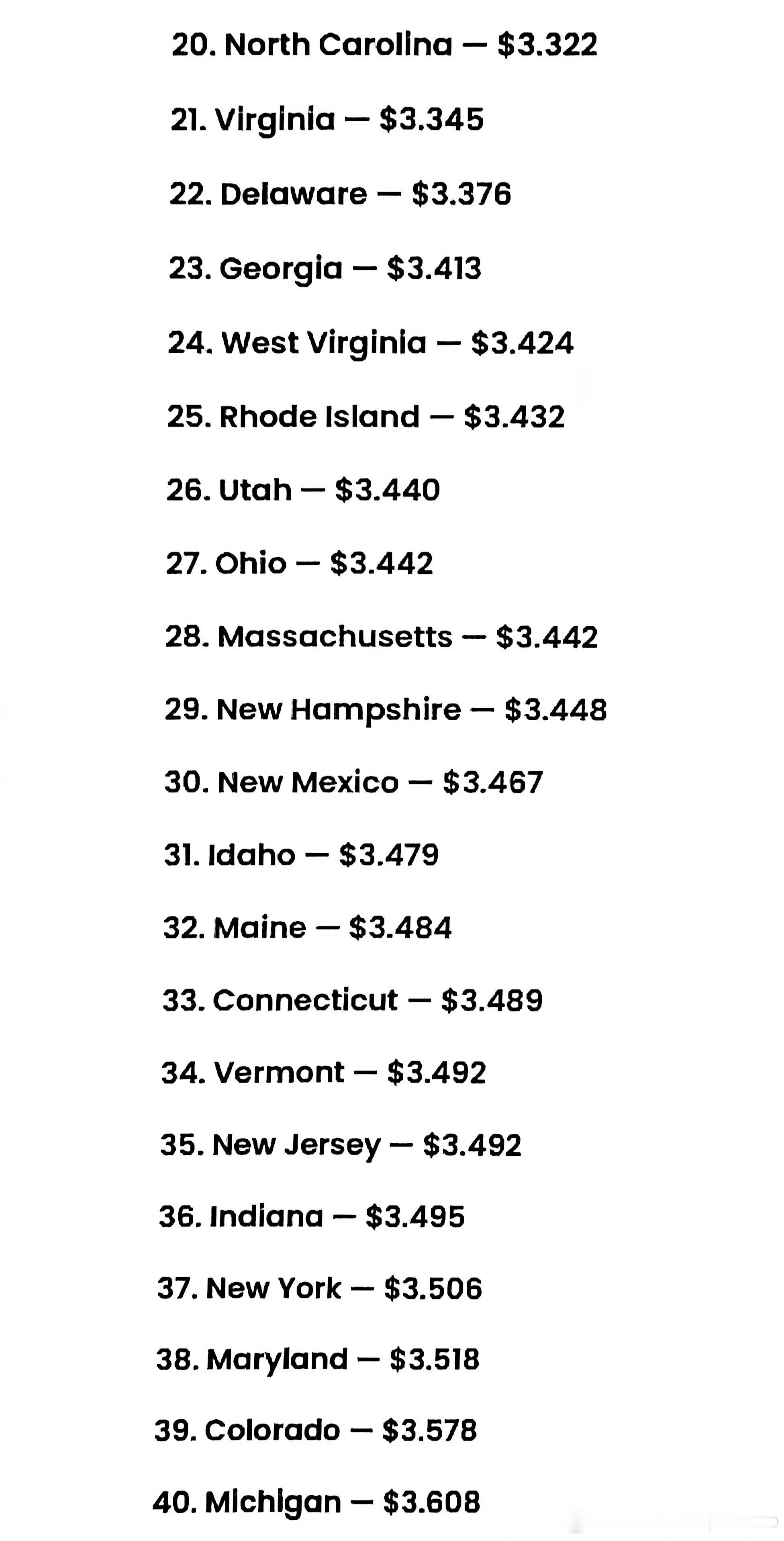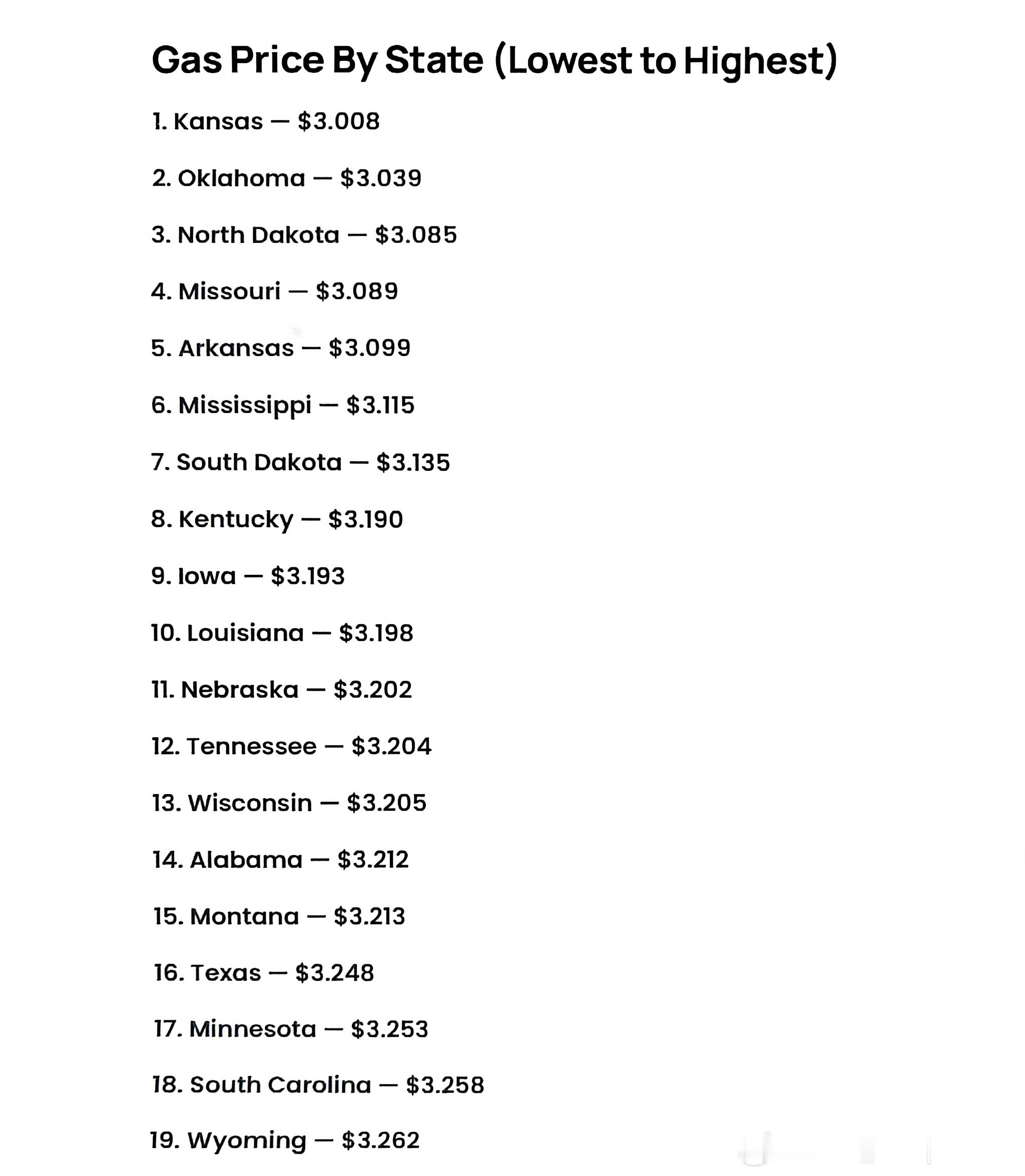 由于中东局势问题,油价飙升。一大早儿也猎奇一下,感受一下当前美国各州的油价。计量单位为加仑(美1加仑约3.78L)按各州的汽油价格(从低到高)够水深火热吗?数据源自motor1