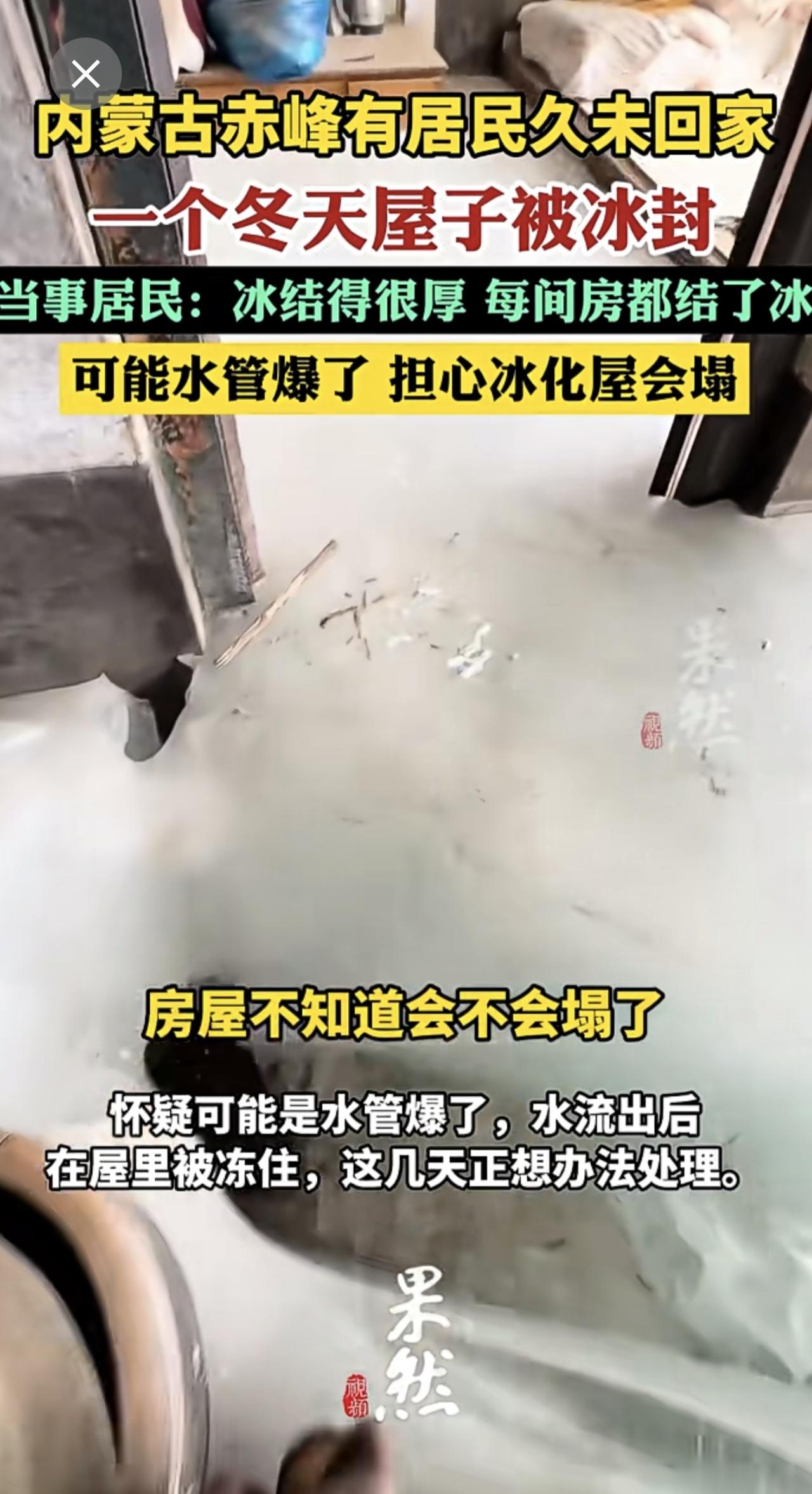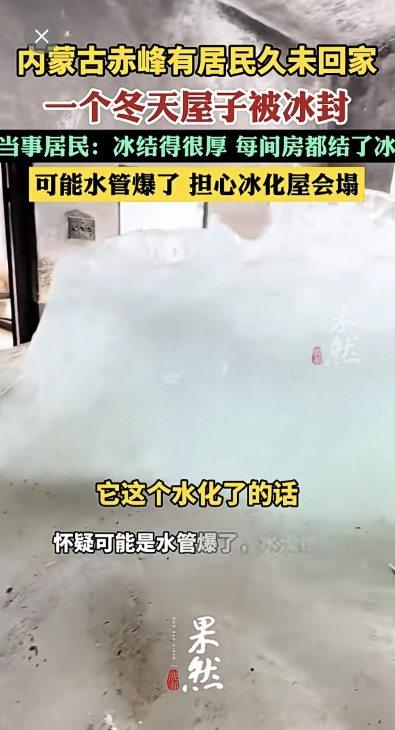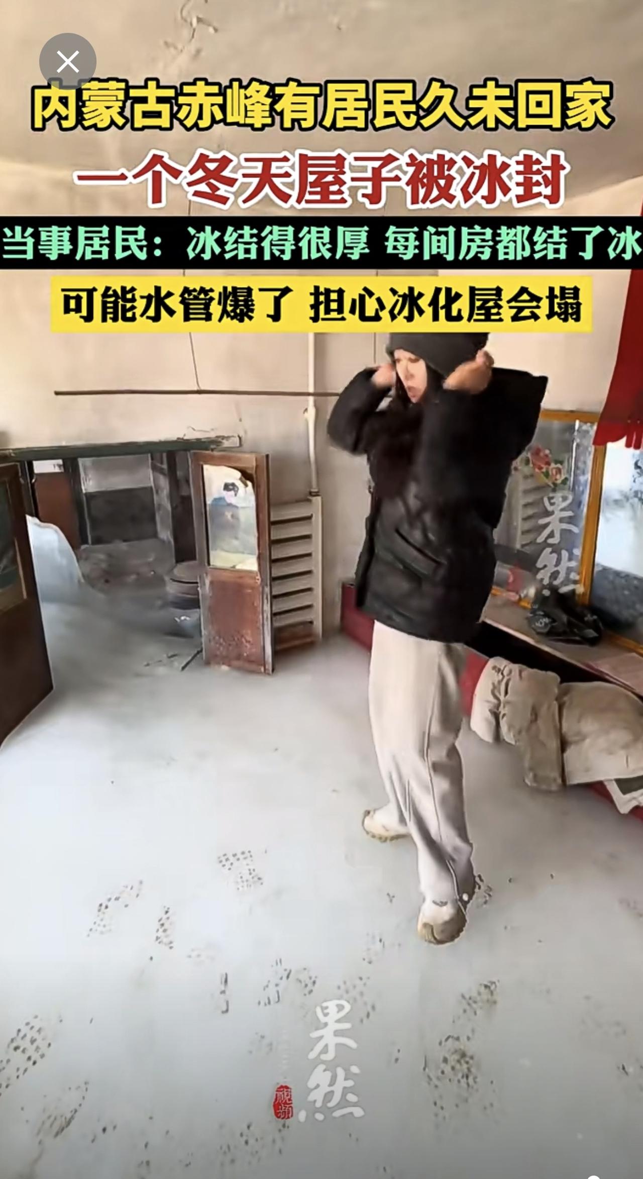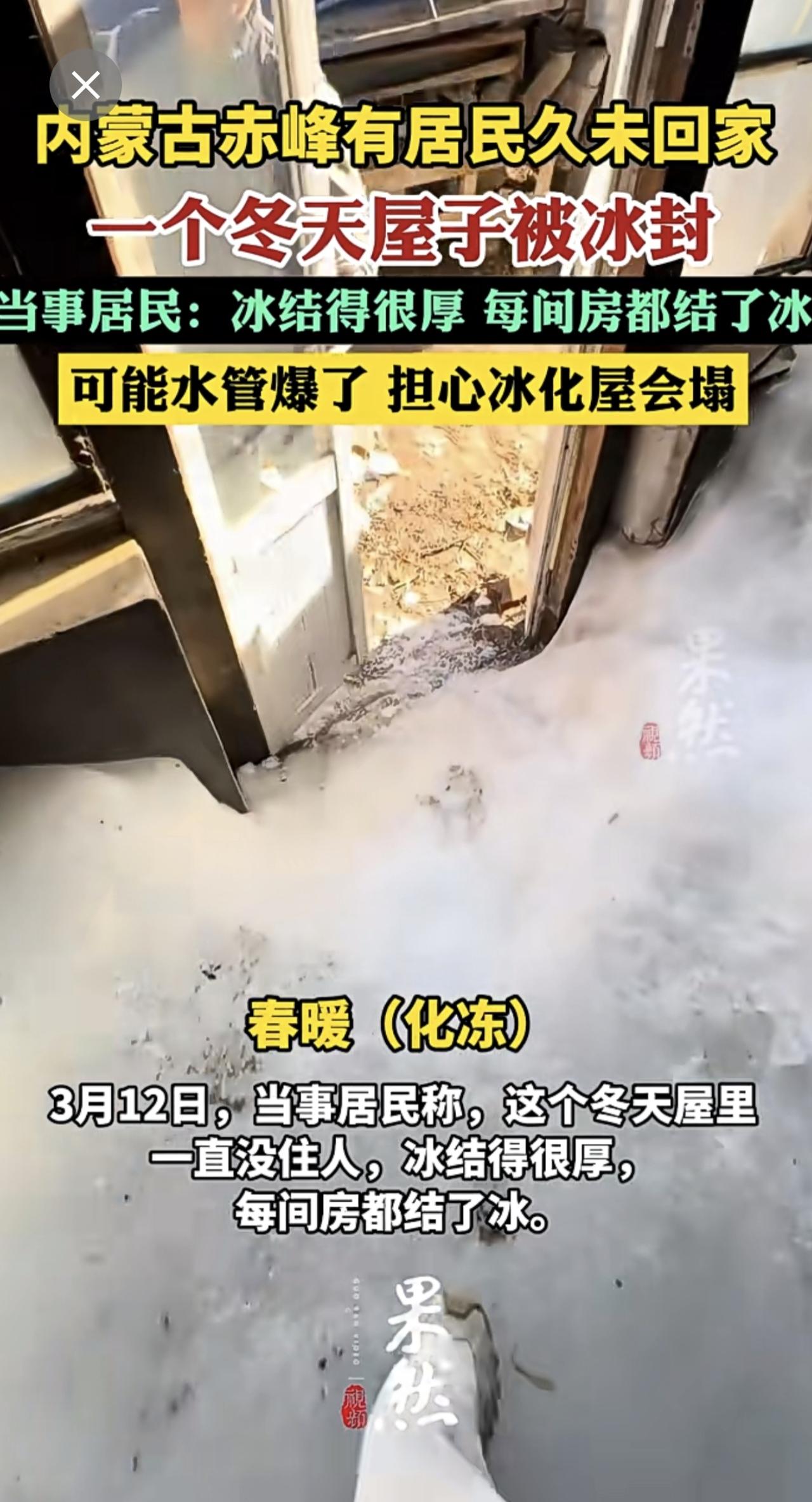 住户一个冬天没回家屋子被冰封:可能水管爆了,担心冰化屋会塌。