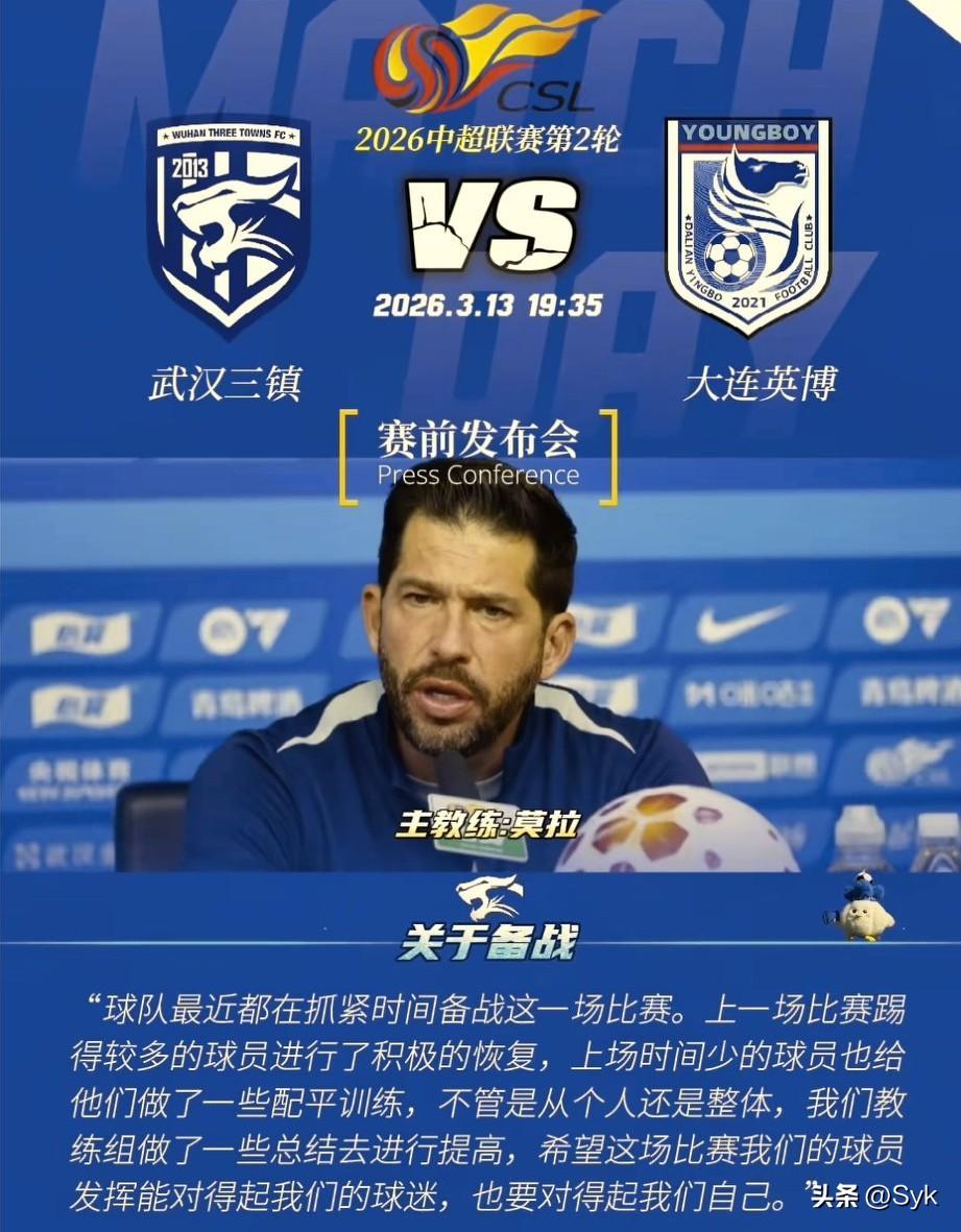 今晚武汉三镇对阵大连英博,感觉还会打平。 今晚中超第二轮先赛一场,武汉三镇主场迎战大连英博,两队首轮均遭失利,都急需抢分止颓。 武汉三镇上轮主场0-2不敌北京国安,攻防磨合不足;大连英博客场3-5憾负上海申花,进攻火力亮眼但防线不稳。 三镇中场核心绍尔复出、阵容趋于完整,大连则由旧将斯坦丘领衔,中场组织更稳。上赛季大连作为升班马,主客场两度与三镇战平,交锋均势明显。 两队近况相近、实力伯仲,三镇主场求稳、大连反击犀利,关键机会把握与防守稳定性将决定走势。 综合两队状况及历史交手,本场大概率延续平局走势,双方各取1分。