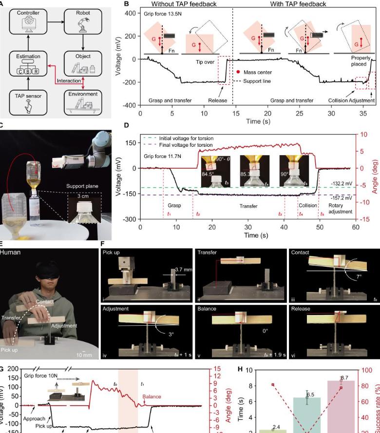 为实现如人类的精细化操作,研究团队提出了一种名为TAP(扭矩-角度-压力)的触觉传感器,这个TAP传感器就像是给机器人的指尖披上了一层高灵敏度的电子皮肤。它的一大绝活是:只用一条通路,就能同时感知“压得多重”和“扭得多厉害”。 TAP传感器通过单个读出通道即可在宽范围(±241.6 牛顿·毫米)内实现双向、高灵敏度(角度分辨率0.1°,扭矩分辨率0.4 牛顿·毫米)和高线性度(R²=0.99)的扭矩感知。 实验表明,TAP传感器能够同时感知压力和扭转信息,响应时间约为20毫秒。将这一传感器集成到机器人控制系统中,机器人能够在无视觉条件下完成多项精细操作任务:
