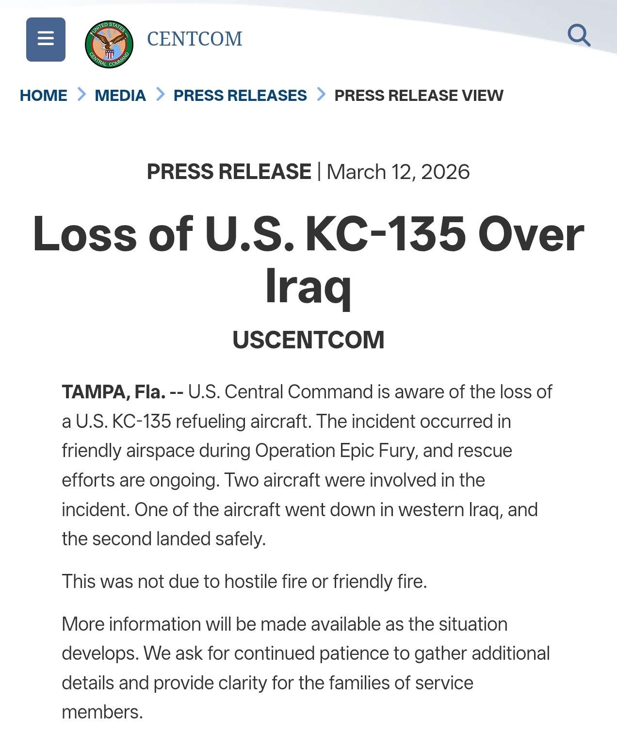 当地时间3月12日,美国中央司令部(CENTCOM)发布官方声明,证实一架美军KC-135空中加油机在伊拉克西部空域发生失事,目前搜救工作正在推进中。 根据声明,此次事件发生在“史诗愤怒行动”(Operation Epic Fury)期间的友军空域,共有两架军机卷入事故:其中一架KC-135加油机坠毁,另一架伴随飞机已安全降落。美方明确表示,坠机原因“并非敌方火力或友军误击”,但未披露更多细节,仅称将在情况明朗后进一步通报,并呼吁公众耐心等待,以便为遇难机组人员家属提供准确信息。 此前,伊朗方面曾称该加油机是被伊拉克抵抗组织导弹击落,且机组人员全部遇难,但这一说法尚未得到独立证实。目前,伊拉克安全部门消息人士透露,坠毁的加油机上载有6名美军士兵,具体伤亡情况仍在核实中。 此次失事正值美以对伊朗发动大规模军事打击的敏感时期,事件的定性与后续调查结果,或将进一步影响中东地区的紧张局势。