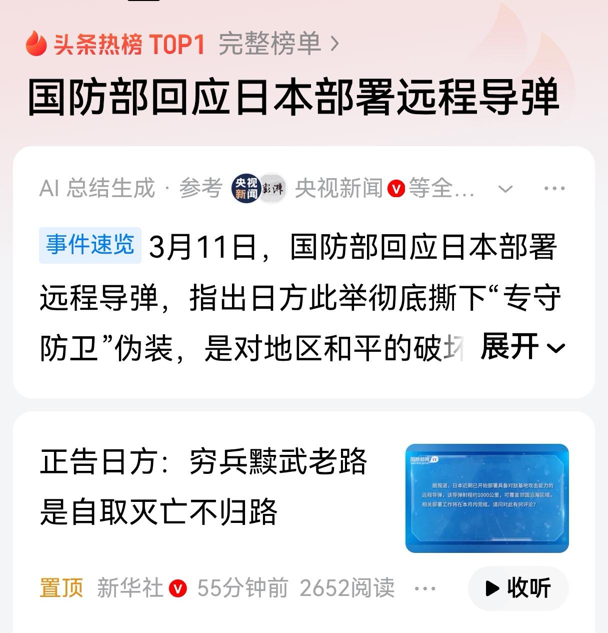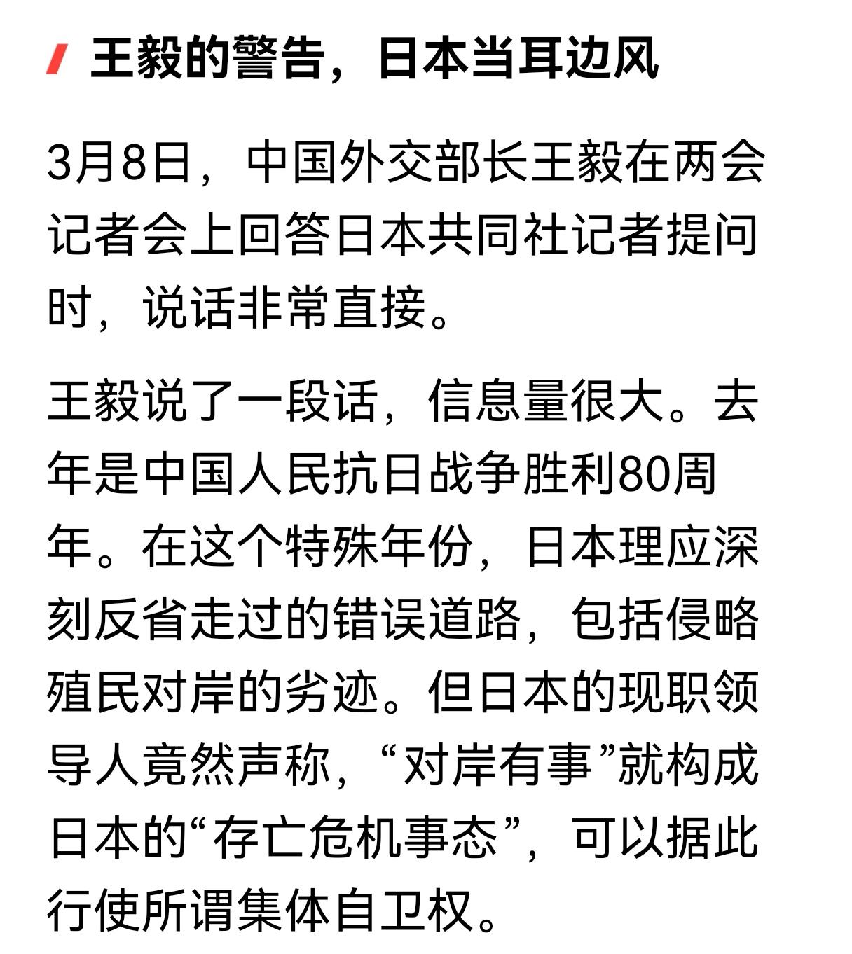 日本无视王毅外长警告,国防部和新华社最新再发警告,勿谓言之不预也,可以先打日本再收台湾! 最近一段时间,日本在台湾问题上的动作越来越出格,完全无视中方的多次严肃警告,不断在危险边缘试探。 面对这种情况,我们国家的外交部门、国防部门以及权威媒体,已经接连发出明确信号,提醒日本不要执迷不悟,不要低估中国捍卫国家主权的决心和能力。 早在之前的外交场合,王毅外长就已经多次向日方阐明立场,台湾是中国领土不可分割的一部分,台湾问题完全是中国的内政,任何外部势力都没有资格插手。 日本作为曾经侵略过中国、殖民过台湾的国家,更没有资格对台湾问题说三道四。然而日方并没有把这些警告放在心上,反而不断发表错误言论,试图插手台海事务,甚至放出所谓“台湾有事就是日本有事”的狂言,严重破坏中日关系的政治基础,也严重挑战战后国际秩序。 日本的这些做法,不仅是对中国主权的挑衅,更是在重走危险的老路。近年来,日本不断突破和平宪法限制,加快军事扩张,发展远程打击能力,一步步放弃专守防卫承诺,这些动向都让地区国家高度警惕。 历史已经证明,穷兵黩武不会有好结果,日本如果继续在错误的道路上走下去,最终只会自食恶果。 面对日方的一再挑衅,我国国防部在最新的发布会上明确正告日方,任何企图武力介入台海局势的行为,都必将遭到迎头痛击,付出惨痛代价。 国防部强调,中国军队始终保持高度戒备,有决心、有能力、有信心捍卫国家主权和领土完整,任何外来干涉都不可能阻挡中国实现完全统一的历史大势。 新华社等权威媒体也接连发声,指出日本在台湾问题上的操弄注定失败,纵容“台独”势力、干涉中国内政,必然要承担相应后果。 台湾问题是中国核心利益中的核心,实现祖国完全统一是中华民族的坚定意志,是不可阻挡的历史潮流。“台独”分裂势力与外部干涉势力相勾连,是台海和平稳定的最大威胁。 我们始终愿意以最大诚意、尽最大努力争取和平统一的前景,但绝不允许任何人、任何势力把台湾从中国分裂出去。 日本应该清醒认识到,中国政府和中国人民在国家主权和领土完整问题上没有任何妥协退让的余地。中方的警告不是空话,而是说到做到。 日方必须立即停止在台湾问题上的错误言行,停止干涉中国内政,停止向“台独”势力发出错误信号,否则必将承担由此产生的一切严重后果。 国家统一、民族复兴是大势所趋、民心所向。任何逆历史潮流而动的人,任何试图阻碍中国统一的势力,最终都只会被历史的车轮碾碎。 我们奉劝日本,认清历史大势,恪守中日四个政治文件精神,不要再做损害两国关系、危害地区和平的事情。勿谓言之不预。