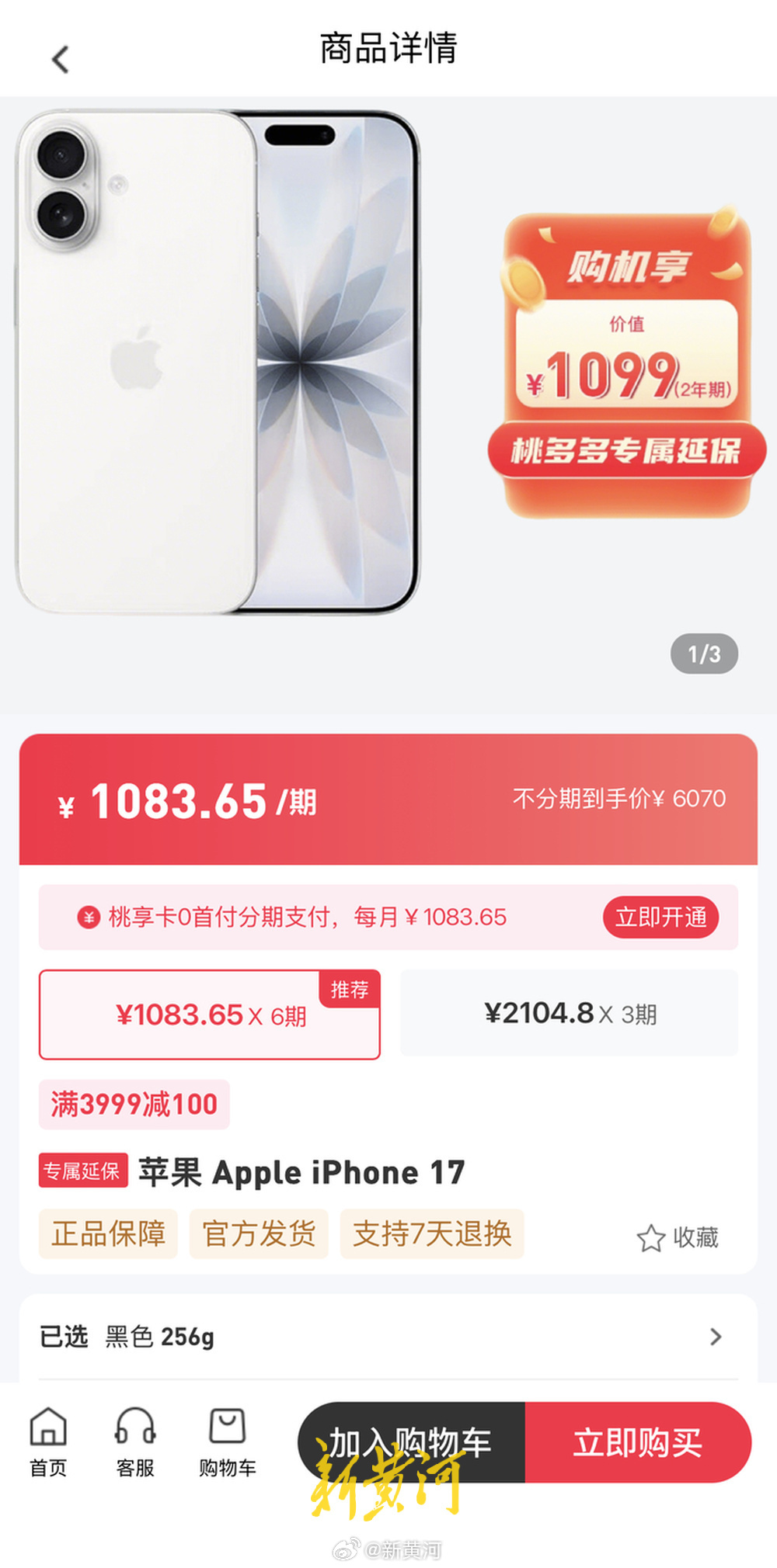 类似的溢价现象广泛存在。以桃多多热销推荐的iPhone17 512G版本为例,此款手机官方平台售价为7999元,在该平台售价8180元,分期价格分别为8762.04元(分6期,每期1460.34元)和8509.35元(分3期,每期2836.45元)。