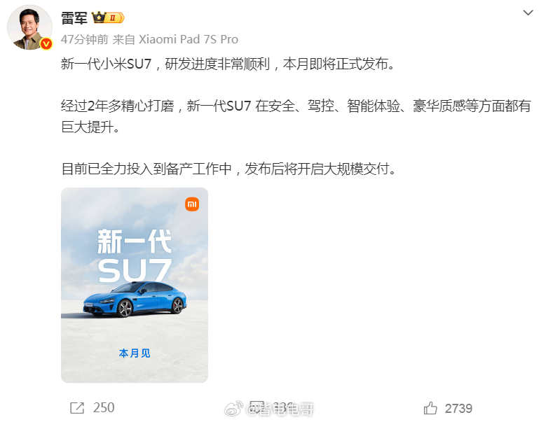 新一代小米SU7 这个月就要和我们大家见面了
