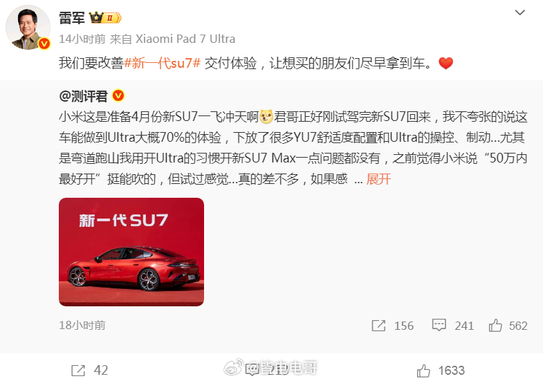 而且新一代的SU7的升级变化,通过多家测评之后可以简单总结一下:YU7的舒适下放到了新一代SU7,同时Ultra的性能、操控、制动…等等都可以在新SU7身上看到