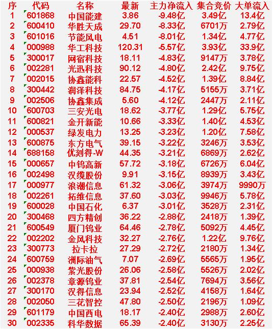 3月13日开盘35分钟,主力“卖出的 ”名单! 中国能建 主力净流入-9.48亿 华胜天成 主力净流入-8.33亿 节能风电 主力净流入-8.01亿 华工科技 主力净流入-5.57亿 网宿科技 主力净流入-4.83亿