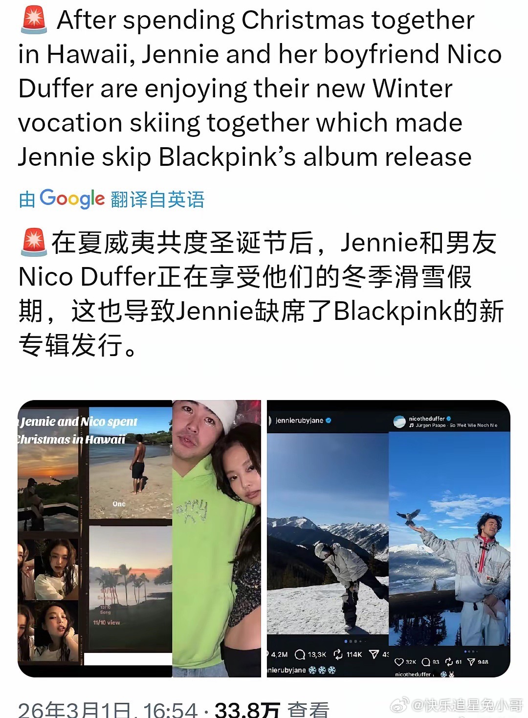 曝Jennie与宝马二公子上个月甜蜜滑雪度假,据悉两人已相识超过两年!