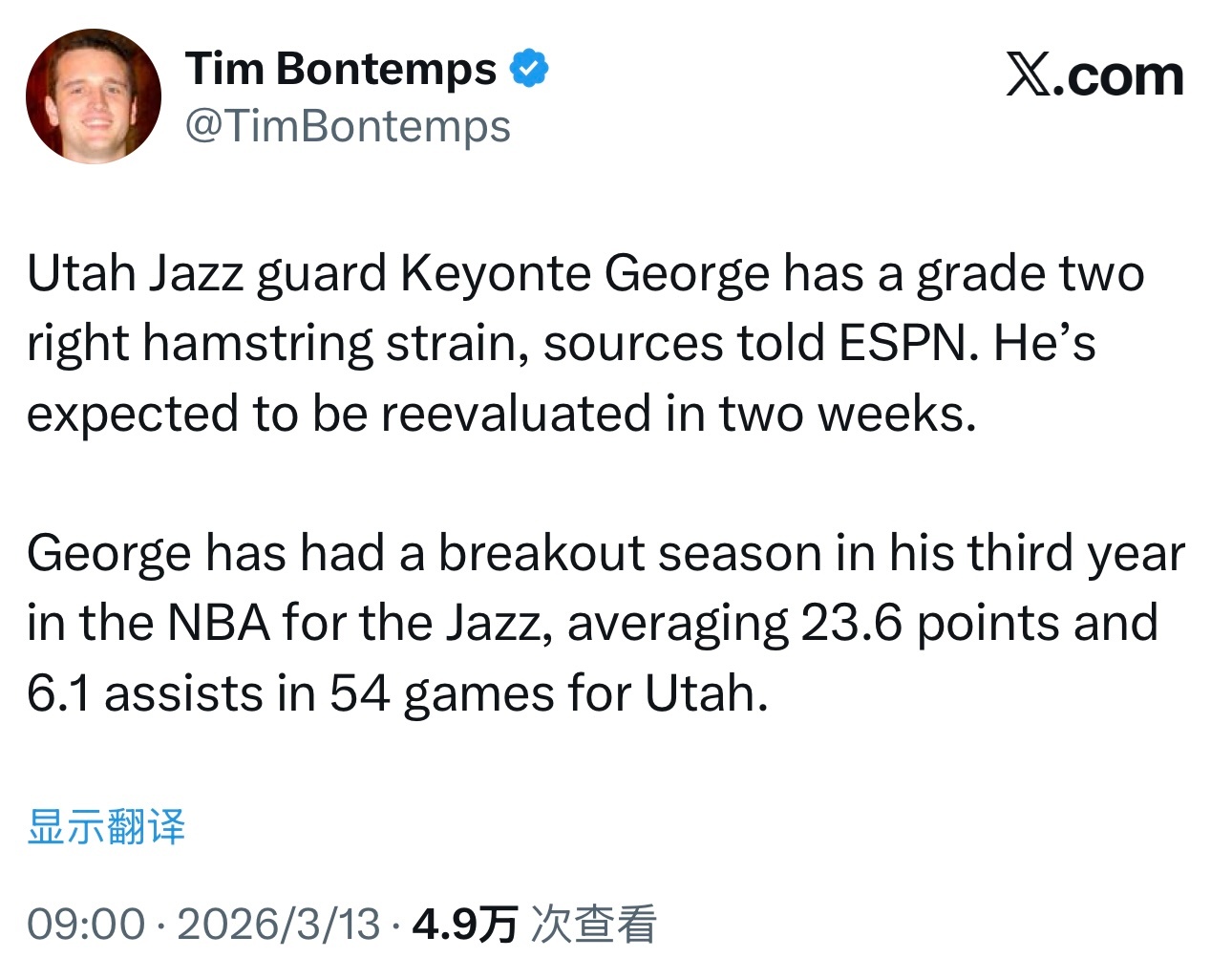 摆了摆了爵士后卫乔治右腿筋拉伤,两周后复查。