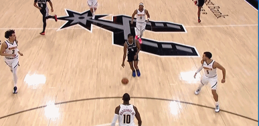 什么叫艺高人胆大 福克斯这个球就是最好的解释。 福克斯持球进攻,处于掘金的包围圈中心,前后左右4个方向都有掘金队员。福克斯只是用眼神往右侧布莱恩特的位置瞄了一眼就把掘金防守队员琼斯给调走了,紧接着使出了一个经典的欧洲步晃过了哈达威的防守上篮成功。 这个球福克斯简单的几个动作就把掘金的防守给肢解,太精彩了