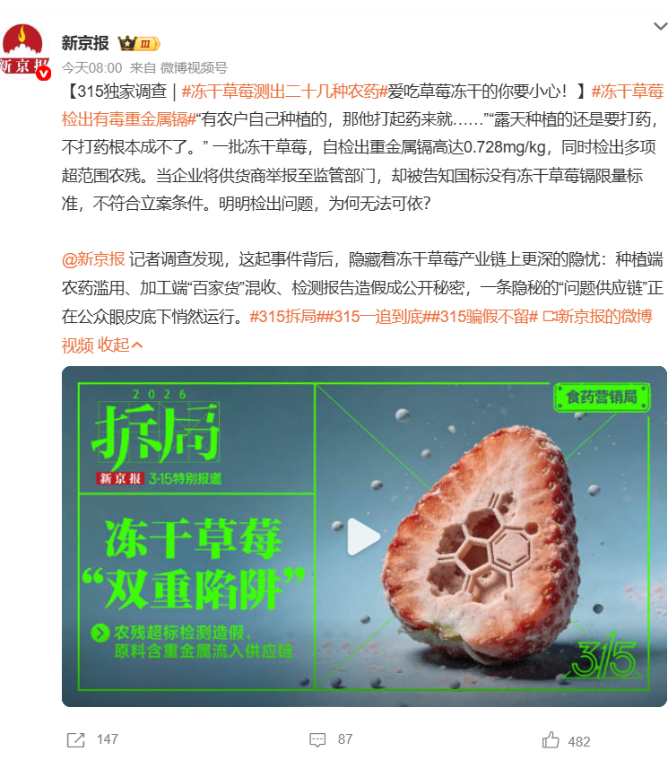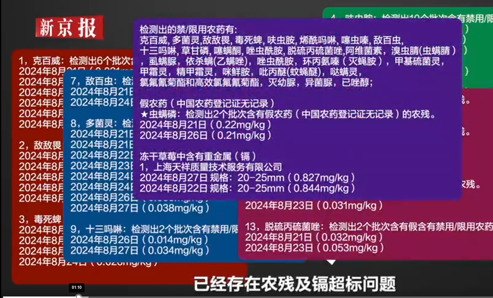 冻干草莓测出二十几种农药?多少种??新闻中这位举报的林女士真的很勇敢啊!其实如果有地,草莓直接种在地上也挺好,草莓藤自己会一生二,二生三,然后可以收获无公害的草莓,自然成熟的草莓特别香。小时候家里种草莓,我好几次午睡被爸妈摘的草莓香醒,真是美好的回忆。