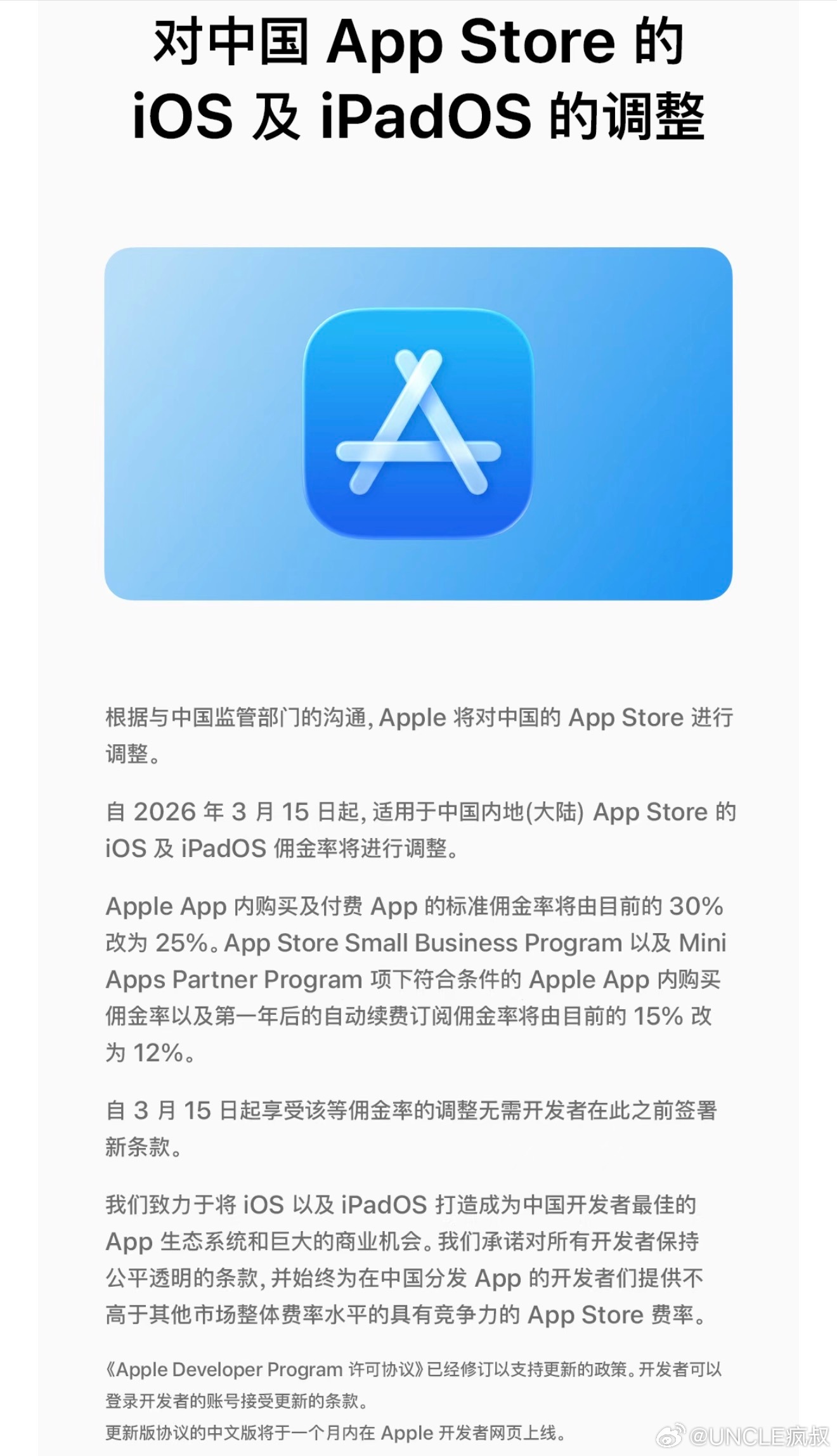 苹果宣布自2026年3月15日起,对国区App Store的iOS及iPadOS佣金率将进行调整,App内购买及付费App的标准佣金率将由目前的30%改为25%.