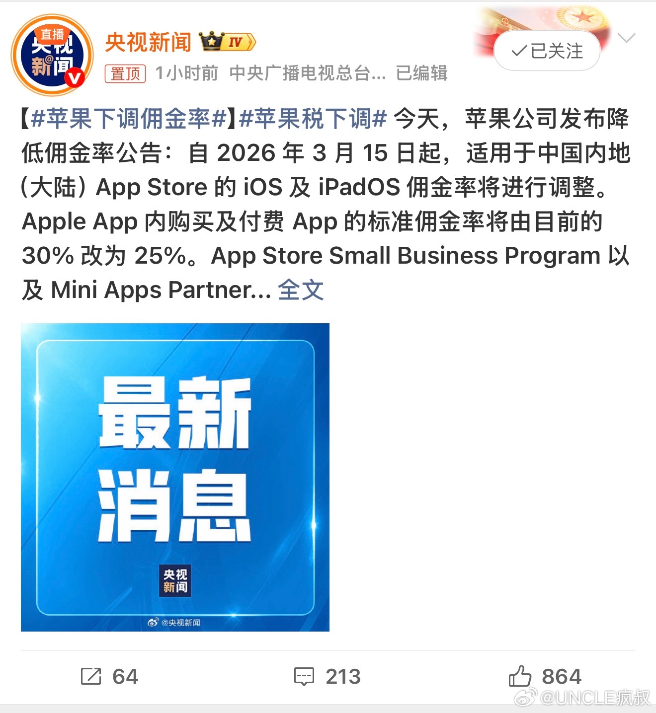没想到还让央妈转发了,看看后续大家在打车或者一些会员充值道具购买时会不会降价吧?
