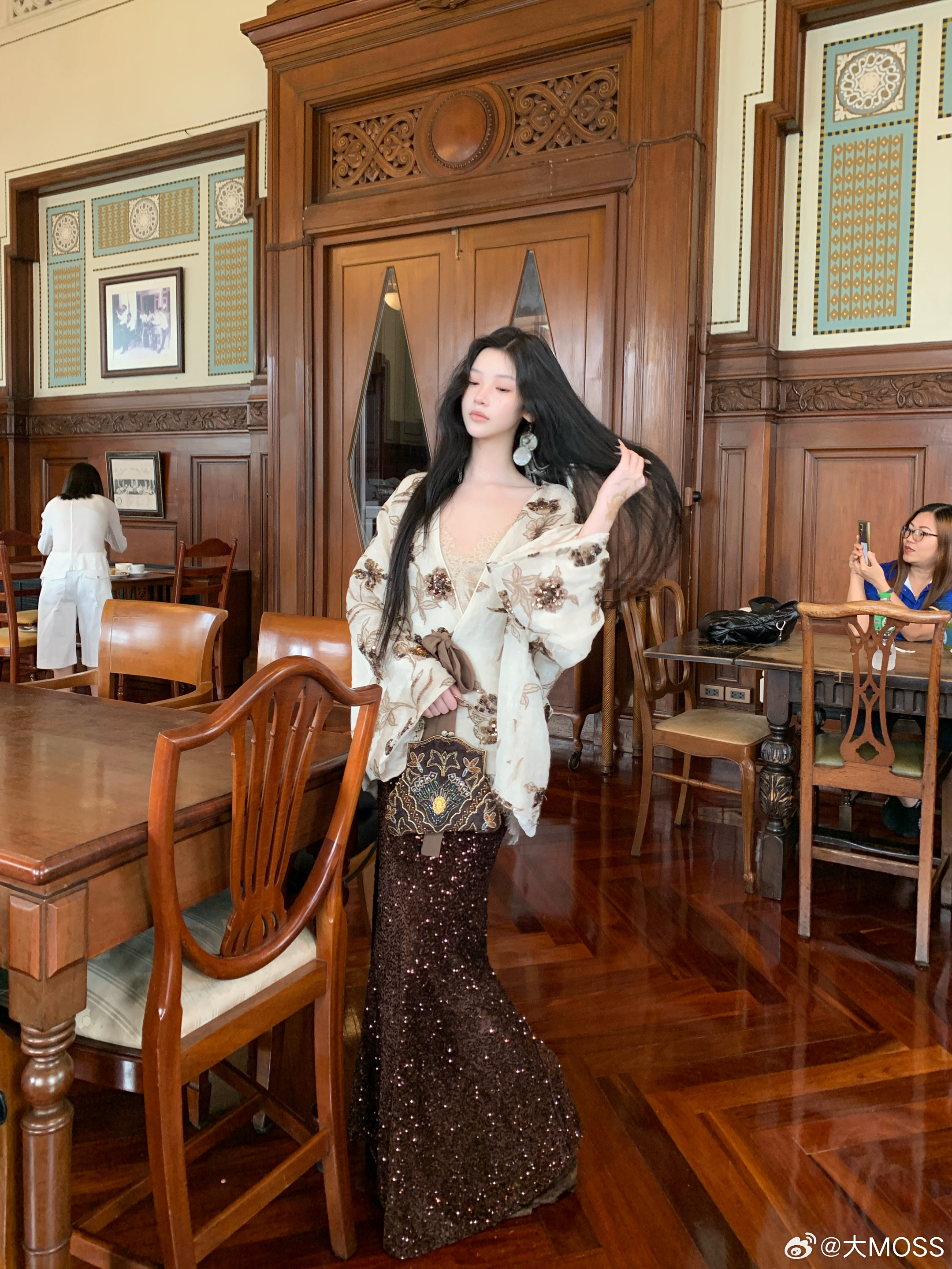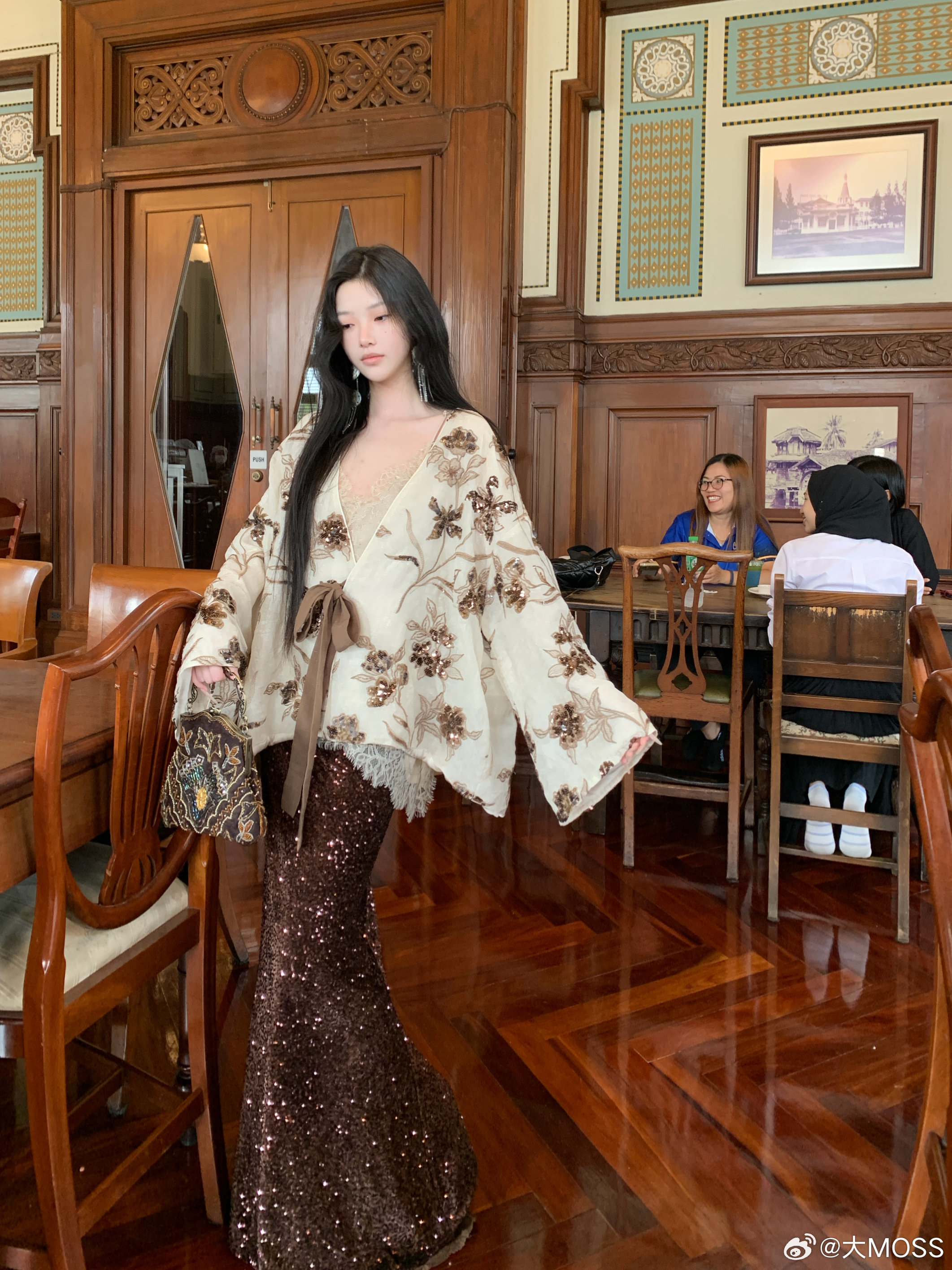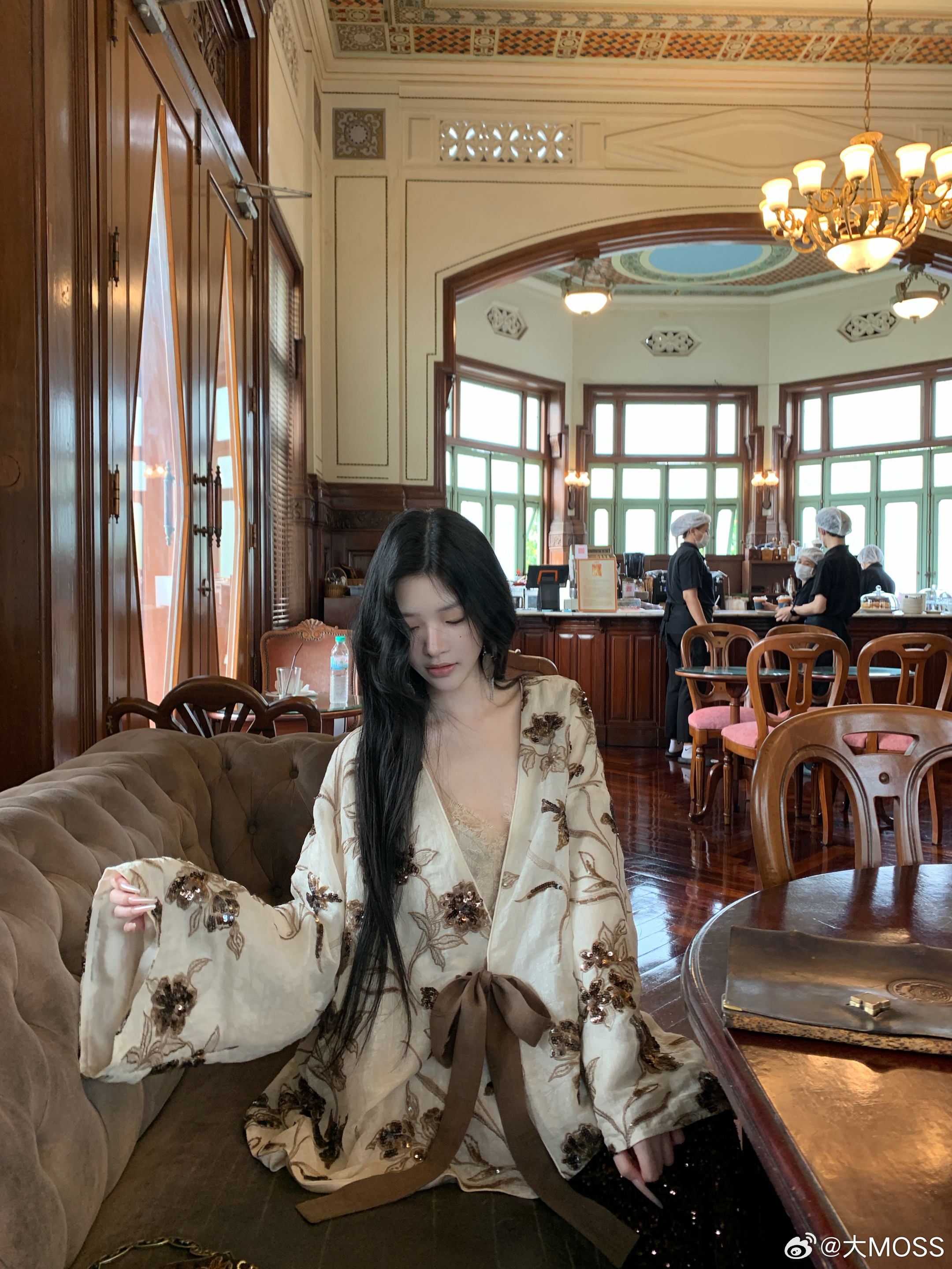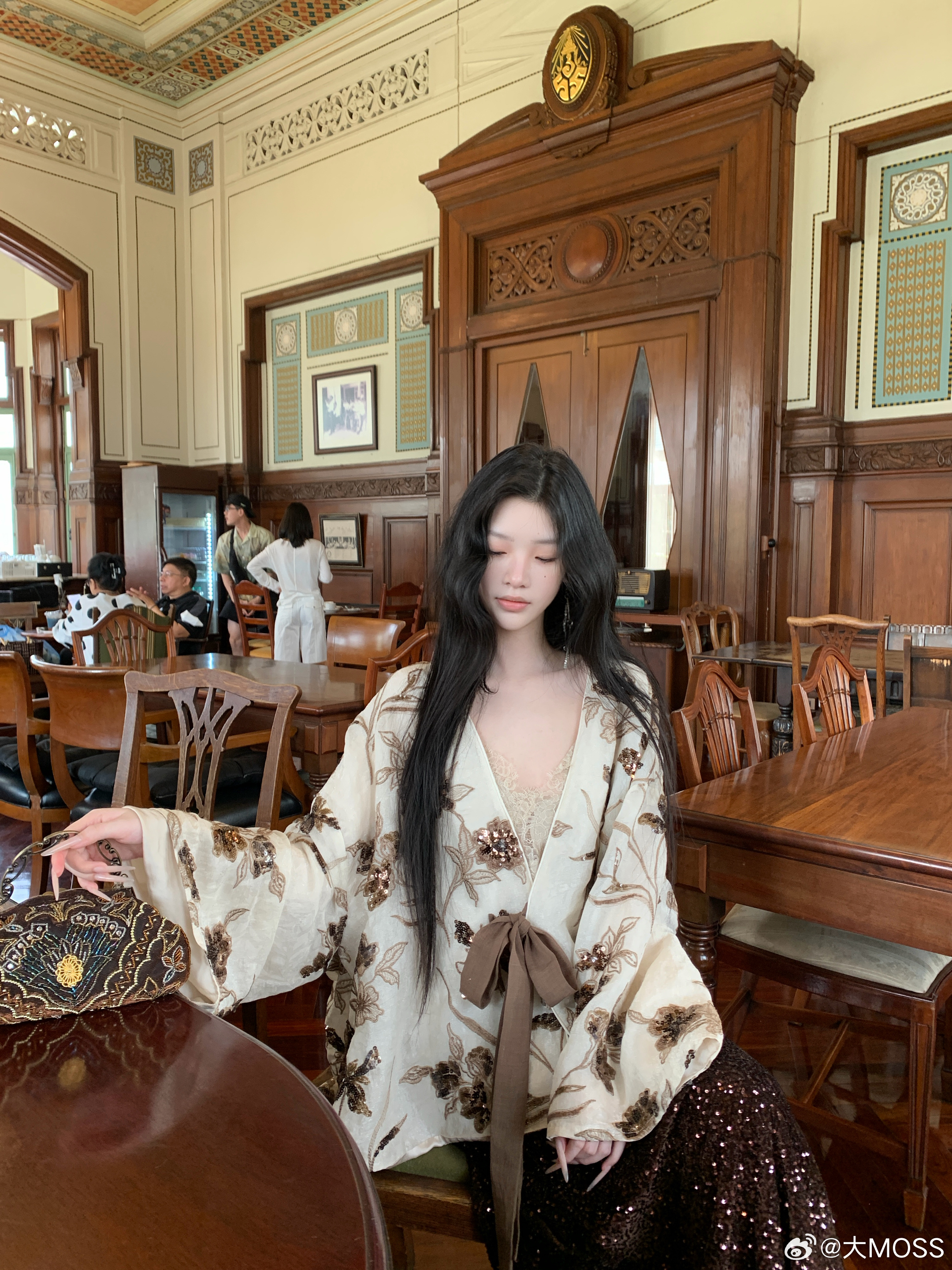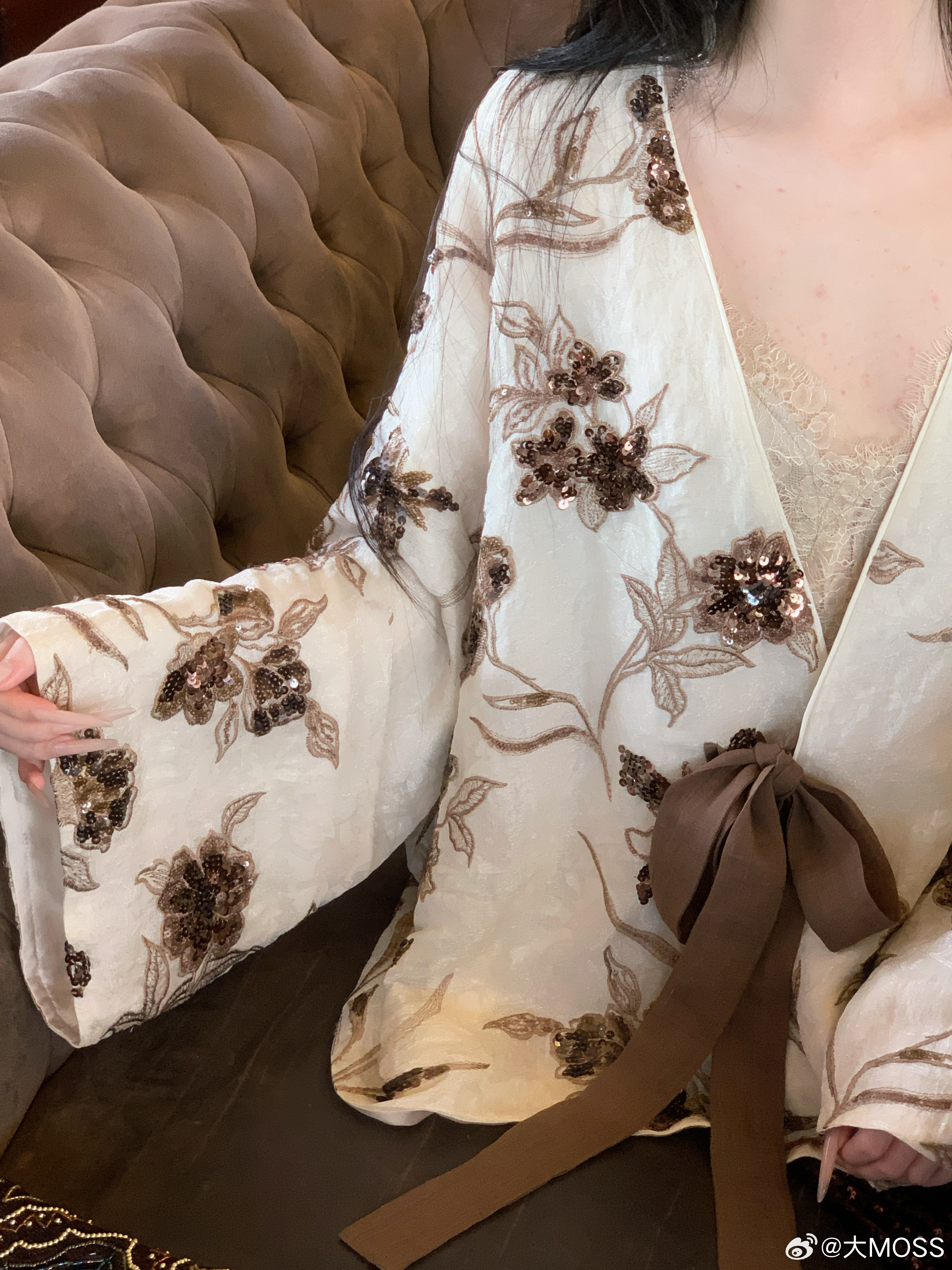 𝑴𝑶𝑺𝑺 𝟑.𝟏𝟓/𝟐𝟎:𝟎𝟎𝒑𝒎【水墨兰亭】新中式重工珠绣撞色系带外套以温柔的薄暮杏为底色,自带朦胧柔和的氛围感,衣身采用重工撞色珠绣工艺,将水墨风格的兰草花枝纹样立体呈现。新中式穿搭