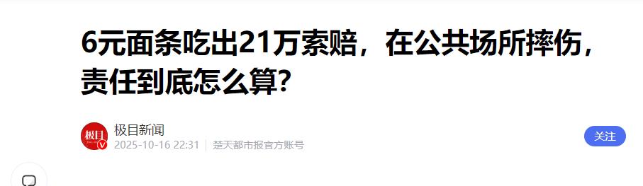 “锅从天降!”湖南,一女子在餐馆,花6块点了碗面,岂料在起身时,高跟鞋踢到门台阶摔倒,造成左腿骨折住院,事后,女子认为是餐馆没做好安全措施,要求对方赔偿21万,而法院判决令人意外! 在湖南岳阳的一条街边,张老板经营着一家不起眼的素面馆,一碗面只卖6块钱。这种薄利多销的小生意,赚的每一分都是辛苦钱。 然而,因为一份法院判决书,张老板半年的血汗钱瞬间清零,他被判赔偿一名顾客3万多元。 这件事起因于一场再普通不过的午餐。老顾客刘女士穿着细高跟鞋进店,熟练地排队、点餐。就在她走向座位的过程中,脚尖踢到了玻璃门处的石材门槛。 由于重心不稳,刘女士重重地摔倒在店里。这次摔跤后果很严重,经诊断为髌骨骨折,最终伤情还被鉴定为残疾。 随后,刘女士将面馆告上法庭,索赔金额高达21万元。她认为,店里的台阶设计不合理,是导致她受伤的直接原因。 面对巨额索赔,张老板觉得十分委屈。店开了好几年,每天进进出出的食客成百上千,别人都没出过事。况且刘女士是常客,对店里的环境应该很熟悉,自己摔倒怎么能全赖店家? 法院经过实地勘察发现,面馆在台阶处理上确实做了一些工作,比如地面干燥、有防滑处理。但问题出在细节上,台阶本身存在一定的坡度,最关键的是,店里没有任何醒目的“小心台阶”或“防滑”等安全警示标语。 根据法律规定,经营场所的管理者如果没能尽到安全保障义务,就必须承担相应的侵权责任。 最终,法院给出了定责。刘女士作为成年人,穿着高跟鞋在公共场所行走,没有尽到审慎的注意义务,应当自担85%的责任。而张老板因为管理上的疏漏,承担15%的次要责任。 3万多元的赔偿款,对大饭店来说可能不算什么,但对一碗面只卖6块钱的小店来说,这意味着张老板要卖出约25000碗面,才能填平这个窟窿。 这起案例在网上引发了不少讨论。有人心疼老板,觉得这是“人在店中坐,祸从天上来”。也有人认为判决合情合理。 法律释放出的信号很直接,作为经营者,不仅要保证硬件合格,还要考虑到各种潜在风险并给出明确提醒。 这种纠纷其实折射出当下社会对公共安全责任的细化。虽然3万元的赔偿让小商户感到压力巨大,但它也提醒了所有空间管理者,必须主动排查掉那些看似不起眼的隐患。 现在的张老板,在店里最显眼的地方贴上了大红色的“小心地滑”告示。这些字迹虽然破坏了店面的视觉统一,却成了小店最稳固的安全保障。 法庭可以按照比例划分经济赔偿,但身体的伤残和精神的压力却很难彻底抹平。希望每个行走在公共场所的人,都能多留意脚下那几厘米的起伏。也希望每位店主,都能重视那一张几块钱就能买到的警示贴纸。 信息来源:《6元面条吃出21万索赔,在公共场所摔伤,责任到底怎么算?》,极目新闻,2025年10月16日。