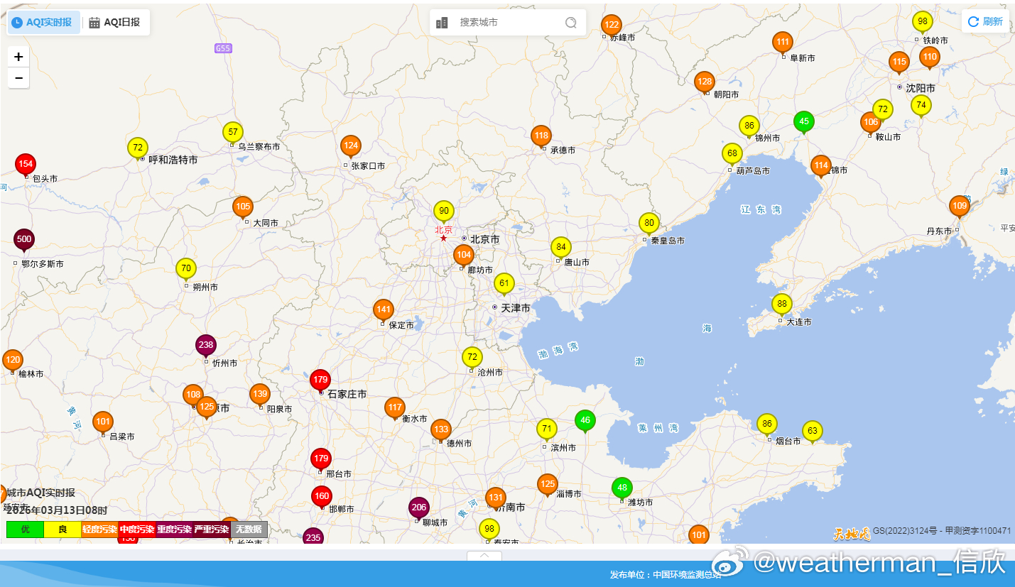 从今晨空气质量看,华北到黄淮等地,存在轻度-中度污染,河北南部、山东西部、河南北部重污染,依然有霾。今天到明晨,随着冷空气和降水到来,霾向南转移。明后2天,在冷空气和降水的清除下,有望减弱结束。