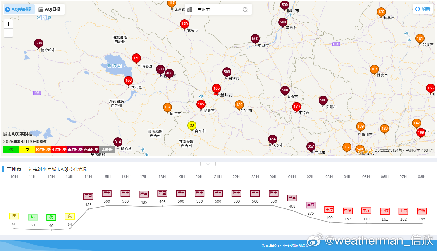 【沙尘】从今晨的观测和空气质量看,在新疆塔里木盆地,青海北部和东北、甘肃部分地区、宁夏、内蒙古西部等地,依然有大范围沙尘。新疆和田PM10浓度有4825微克/立方米,8倍的爆表。不过目前在甘肃、宁夏、陕西等地已经有降水出现,兰州今天凌晨下了点,空气质量从爆表好转为中度污染。