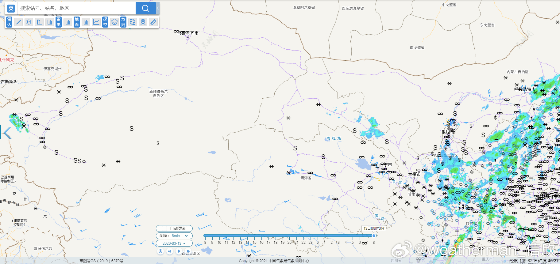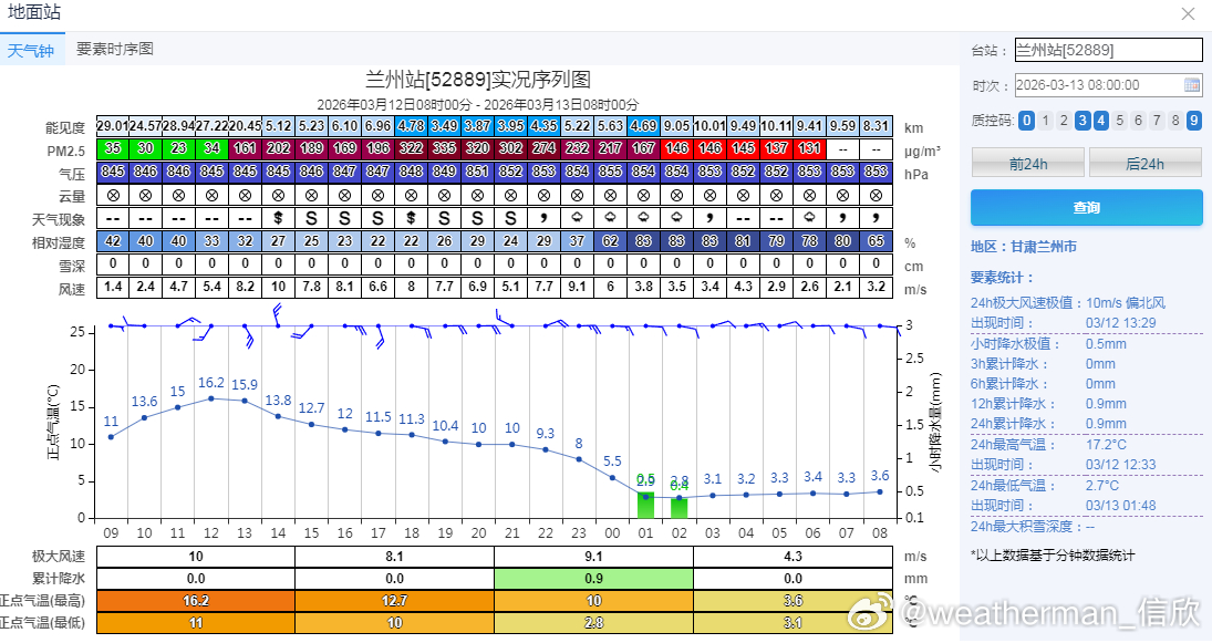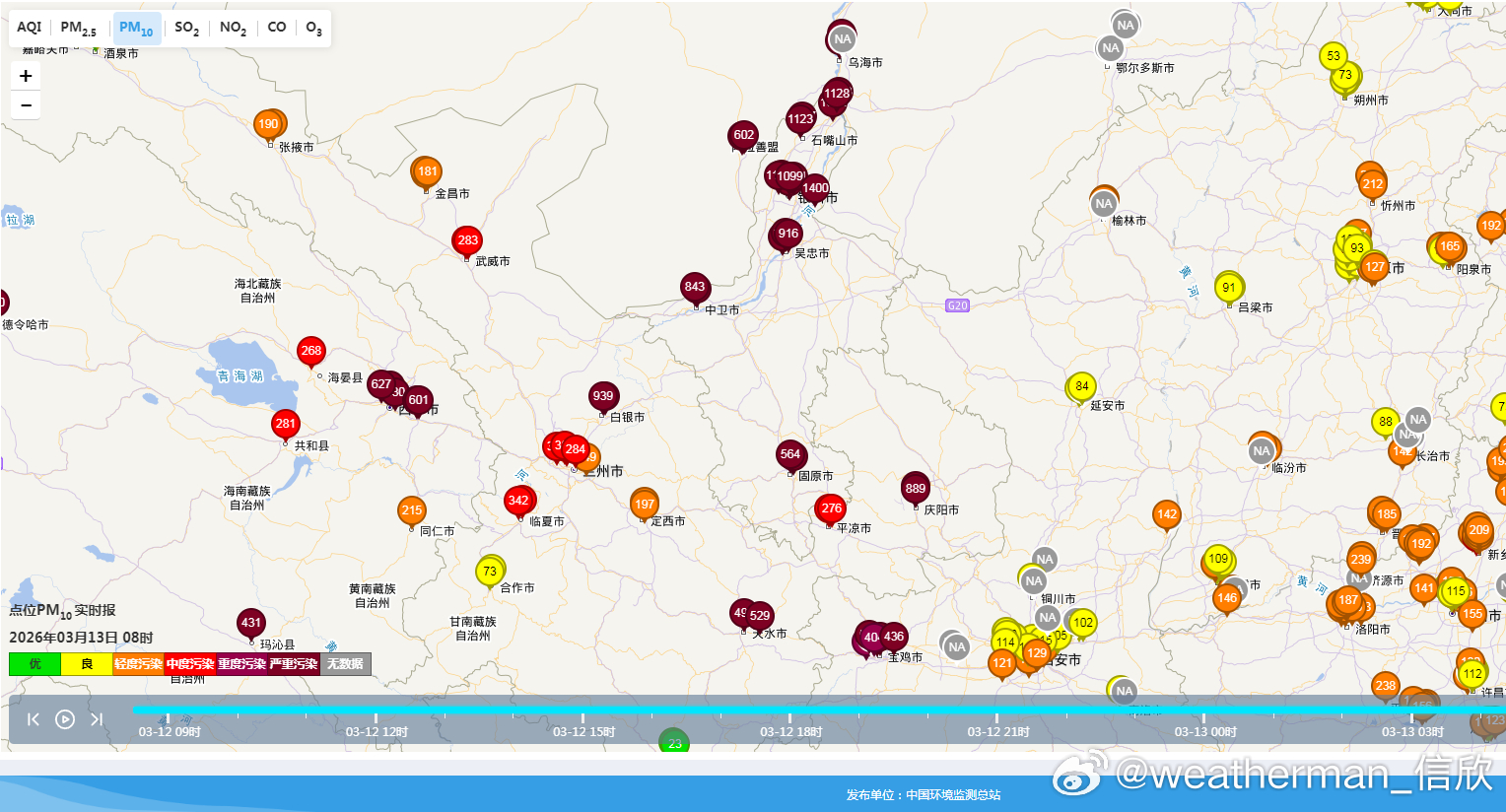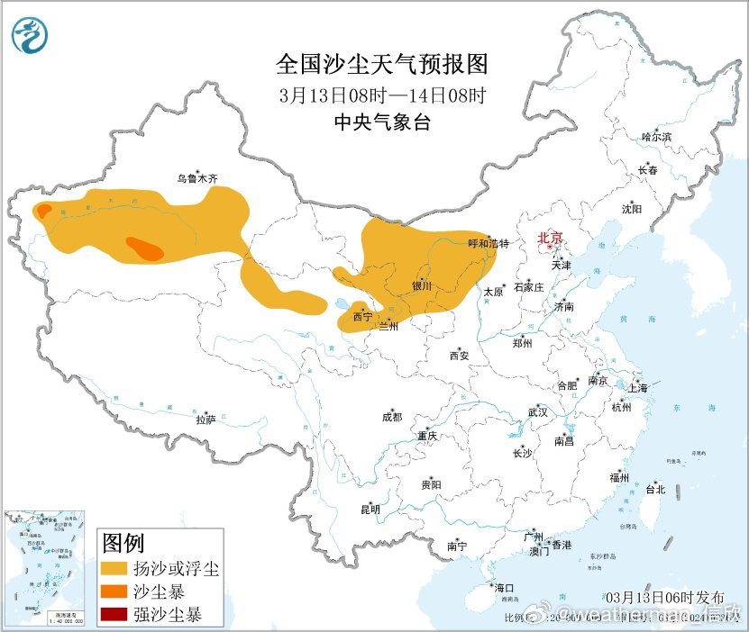 今天青海东部、甘肃南部、宁夏南部的沙尘会减少减弱,因为降水增多,湿沉降作用,利于清除沙尘,但要警惕泥点子雨或者提拉米苏雪。而在降水区之外,沙尘继续。中央气象台今晨继续发布沙尘暴蓝色预警:预计3月13日08时至14日08时,新疆南部、内蒙古西部、甘肃西部、青海北部、宁夏中北部、陕西北部等地的部分地区有扬沙或浮尘天气,其中,新疆南部局地有沙尘暴。