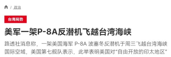 真嚣张!在中东脱不开身,美国竟然在台湾又对我们进行挑衅!3月12日,根据法新社报道,法媒称,一架美国海军 P-8A 波塞冬反潜机于周三飞越台湾海峡,美国第七舰队对此表示称,美国按照国际法在台湾海峡行动,美国维护所有国家的航行权和自由。很显然,美国战机在台海飞行,明显是故意为之。   先说说美国在中东的窘境。2月底美国对伊朗发动突袭,原本说好了“四天内结束”,结果打了十几天还没脱身。头六天就花了113亿美元,平均每天八到九亿美元,智库估算100小时就花了37亿美元,这样的烧钱速度,美国这样的经济体也扛不住。   军事库存更是告急,拦截伊朗无人机的“爱国者”和“萨德”导弹消耗极快,中东战区的弹药储备只够维持两周高强度打击,关键雷达被摧毁后短期内还没法补充。   国内反战情绪也闹得凶,50多个城市爆发游行,59%的受访者反对对伊行动,70%选民担忧经济状况,特朗普的支持率一路下滑。   盟友那边也不省心,五角大楼急调三支航母群赶往中东,还公开拒绝英国的援助,骂人家是“墙头草”,盟友们心里早就各有盘算。伊朗这边反而掌握了主动权,还没拿出全部杀手锏,美国想撤却没台阶下,彻底陷入了进退两难的局面。   就在这种自顾不暇的情况下,美国还不忘跑到台海来搞事情,时间点卡得特别巧,正好是特朗普计划访华的前夕。   这可不是偶然,而是美国精心设计的算计。首先是想拿台湾当棋子,继续搞“以台制华”,通过频繁派军机舰过航台海,虚化一个中国原则,消耗中国的战略资源,打乱我们的发展节奏,维持它在印太地区的霸权地位。2026年开年不到20天,美军就已经三次过航台海,比2025年同期的频率明显提升,挑衅的意图越来越明显。   其次是想在访华前给我们施压,试图在经贸、科技等领域要挟我们做出让步。特朗普这次访华,本质上是想缓解美国的经济困境,争取更多合作筹码。派军机闯台海,既能警告中国,又能稳住亚太的盟友,同时还能平衡国内的强硬派声音,避免被指责“对华软弱”。毕竟美国国内不少势力一直拿台湾问题做文章,频繁搞事能给这些人一个交代。   再者,美国还想把台海问题炒作成国际话题,当成同盟体系内部利益交换的筹码。表面上看,这套操作好像能让美国占点便宜,实际上早就暴露了它多线作战、力不从心的现实。   他现在是到处点火,哪里都想管,结果哪里都管不好,精力被分散得一干二净。   再说说台海的事儿。台湾海峡就是中国的家门口,这是明摆着的事实。美国天天说什么“国际空域”、“航行自由”,这完全是胡说八道。台湾海峡最窄的地方只有一百多公里,两岸都是中国领土。   这片海空域的性质,国际公约和中国的法律都写得清清楚楚,根本没有他们说的那种“国际水域”。他们拿所谓的国际法做幌子,本质上就是霸权逻辑,想怎么说就怎么说,完全不讲道理。   美国所谓的“航行自由”,从来都是双标。只有他们能在别人家门口横冲直撞,别人稍微有点反应,他们就大喊大叫。解放军每次都很专业,会派飞机军舰过去,全程盯着,稳稳地把他们“送”出去,确保家门口的安全。   美国这种“中东陷泥潭,台海搞挑衅”的做法,看着是两手都要抓,其实是顾头不顾尾。他既想在伊朗保住霸权,又想在台海拦住中国,还想平衡国内的各种矛盾,这种贪心的做法注定长久不了。美国的实力早就被他自己的多线作战给消耗了,再加上国内一堆烂事,盟友也越来越离心,他的老大地位已经在慢慢动摇了。   说白了,美国的挑衅根本达不到他想要的目的。中国维护国家主权和领土完整的决心是铁板一块,谁来都不好使。解放军的应对越来越专业,美方的那些小动作根本动摇不了台海的稳定。反而美国自己,天天在全球惹是生非,只会让更多国家看清他的真面目,越来越多的国家会支持一个中国原则。   美国现在的做法,就是典型的穷兵黩武。自己家里问题一堆,还非要到处惹事,最后只会搬起石头砸自己的脚。台海是中国的台海,任何想分裂中国、挑衅中国的行为,都一定会被坚决反制,注定失败。美国与其在全球到处捣乱,不如好好解决自己的问题,这才是正道。