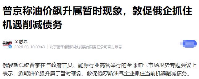 普京是真的清醒,面对最近一路飙升的国际油价,没有跟着盲目乐观,反而第一时间给俄罗斯的能源公司敲了警钟,明确要求他们趁着现在的高油价,赶紧削减债务,把过去几年欠下的账都还上。 俄罗斯能源企业的债务窟窿早就不是小数目,2024年底的数据摆在那,光是 Gazprom 一家的净金融债务就高达6.047万亿卢布,当年支付的利息同比暴涨81.4%,达到7154亿卢布。 整个行业的债务压力都在持续攀升,受中央银行高利率影响,不少公司的信贷利息直接翻倍,长期背着这样的包袱,利润再高也得先填利息的坑。 这些债务大多是前几年油价波动、制裁加码时积累的,当时为了维持产能、开拓新市场,企业不得不靠借贷过日子,如今终于等到油价飙升的窗口期,要是不趁机清理债务,未来只会被利息拖得更惨。 高油价带来的红利看着诱人,实则暗藏太多不确定性。这次油价暴涨主要是中东冲突引发的供应恐慌,霍尔木兹海峡航运受阻,海湾国家减产规模达到670万桶/日,才把油价推到近120美元的高位。 但这种地缘冲突驱动的油价上涨向来不持久,之前就出现过一周内从120美元跌至90美元的情况,一旦中东局势缓和,或者G7释放战略石油储备,油价随时可能回落。 俄罗斯太清楚油价波动的滋味,2025年乌拉尔原油年均价格才57.65美元,比现在的高位差了一半还多,而且受制裁影响,俄罗斯原油长期要比布伦特原油便宜10-30美元出售,这种折扣损失本就压缩了利润空间。 现在趁着价格回升、销量上涨,多赚的钱与其用来盲目扩张,不如先把欠的账还了,相当于给企业装上“防弹衣”。 西方制裁的阴影从来没消散,这也是普京不得不警惕的关键。过去几年,G7的价格上限、运输保险禁令让俄罗斯能源出口处处受限,欧盟这个最大市场丢了之后,俄罗斯只能转向亚洲,不仅要给买家大幅折扣,还得承担更长的海运距离和更高的保险成本。 2025年俄罗斯能源收入已经大跌20%,油气收入占联邦预算的比例从之前的30%-50%降到25%。 更麻烦的是,制裁可能随时升级,一旦西方借题发挥收紧限制,或者切断更多结算渠道,能源企业的现金流可能瞬间承压。 现在还清债务,就能减少对外部融资的依赖,降低被制裁卡脖子的风险,哪怕未来出口遇到阻碍,企业也能凭借健康的财务状况扛过去。 能源市场的长期变革也让高油价的好日子难以为继。全球新能源转型的脚步越来越快,2025年中国非化石能源消费占比已经超过石油,成为第二大能源类型,风电光伏装机量甚至超过了火电。 这种趋势不是短期能逆转的,未来几年可再生能源的占比还会持续提升,石油的长期需求必然会逐步萎缩。 俄罗斯能源出口占GDP的40%,经济结构本就过度依赖能源,要是现在沉迷高油价带来的短期收益,不趁机优化财务结构,等新能源替代进一步深化,油价进入长期下行通道,不仅企业会陷入困境,整个国家经济都会受牵连。 普京正是看到了这种结构性风险,才逼着能源公司放弃短视行为,为未来的行业变革储备抗风险能力。 还有基础设施的脆弱性也不容忽视。乌克兰对俄罗斯能源设施的袭击持续不断,2025年就发动了120次袭击,81次针对炼油厂,导致14%的炼油厂关闭、24%减产,每日损失100万桶加工能力,直接经济损失超过1万亿卢布。 修复这些设施需要大量资金,而能源企业之前的现金流并不充裕,2025年上半年俄罗斯石油公司的自由现金流就骤降75%,连支付股息都显得吃力。 现在用高油价带来的额外收入偿还债务,能让企业未来有更多资金投入设施维护和升级,同时降低财务杠杆,就算再遇到设施遭袭、产能受限的情况,也不会因为债务压力而雪上加霜。 普京的决策本质上是在平衡短期收益和长期安全。俄罗斯能源企业的债务不仅是企业自身的负担,也间接影响着国家财政稳定。 之前为了填补能源收入下滑的缺口,俄罗斯不得不提高增值税,把压力转移到国内。现在企业减少债务,就能减少利息支出,增加利润留存,未来无论是给国家上缴税收,还是投入技术革新、市场多元化布局,都有了更充足的空间。 而且清理债务后,企业的信用评级会提升,未来即便需要融资,成本也会降低,这对于资本密集型的能源行业来说至关重要。 高油价从来不是俄罗斯可以高枕无忧的理由,反而像是一场必须抓住的“窗口期”。普京没有被短期的数字增长迷惑,而是盯着债务、制裁、能源转型、地缘冲突等多重长期风险,逼着能源公司趁势“减负”。 这种清醒不是保守,而是经历过市场波动和国际压力后的务实选择,只有把财务基础打牢,俄罗斯的能源行业才能在未来的不确定性中站稳脚跟,国家经济也才能摆脱对短期能源红利的过度依赖,获得更持久的发展动力。