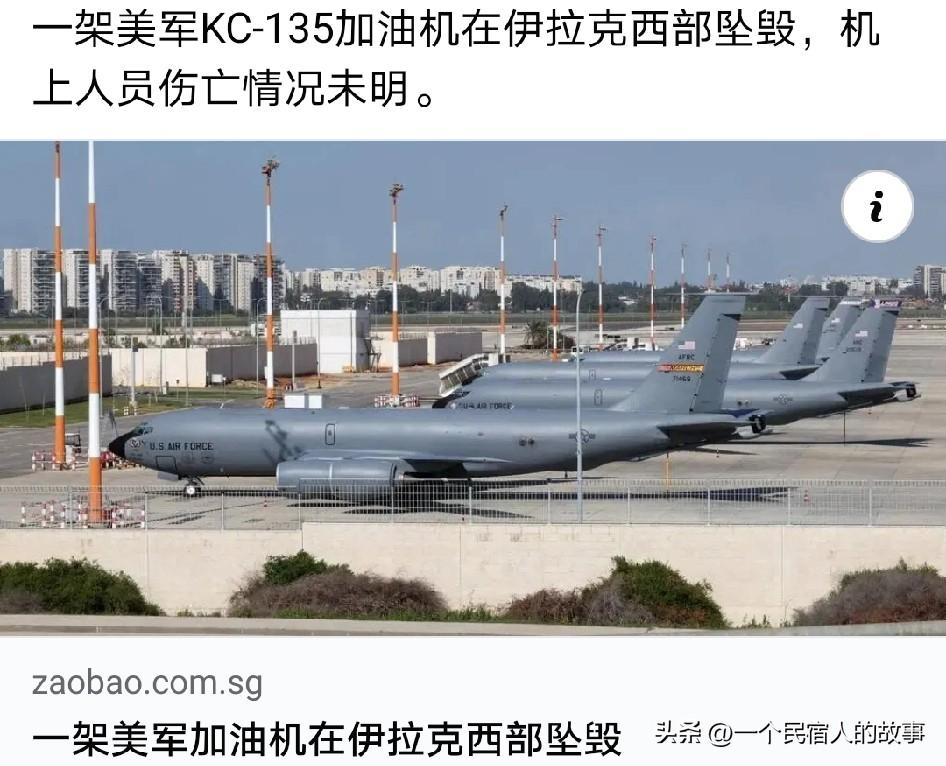 美军加油机被伊朗击落?机上6人全部遇难! 今天上午,一架隶属美国空军的KC-135加油机在伊拉克西部坠毁,伊朗声称伊朗导弹击落该加油机。目前美军证实该加油机啊“非友军击落”,但没说是伊朗击落,根据最新消息。该加油机上6名美军士兵全部遇难!