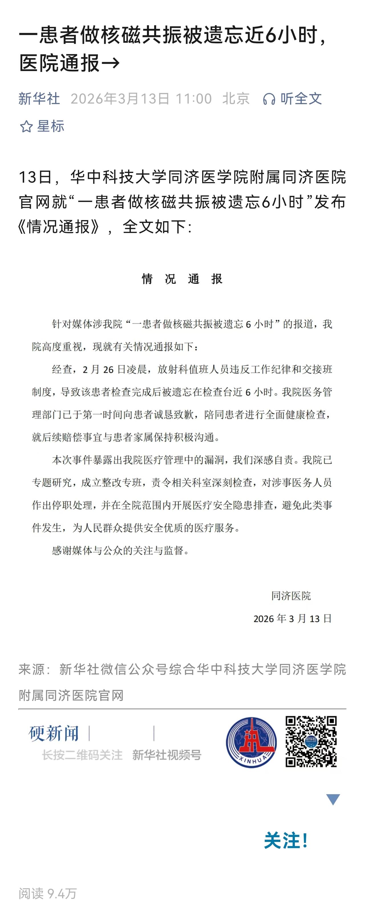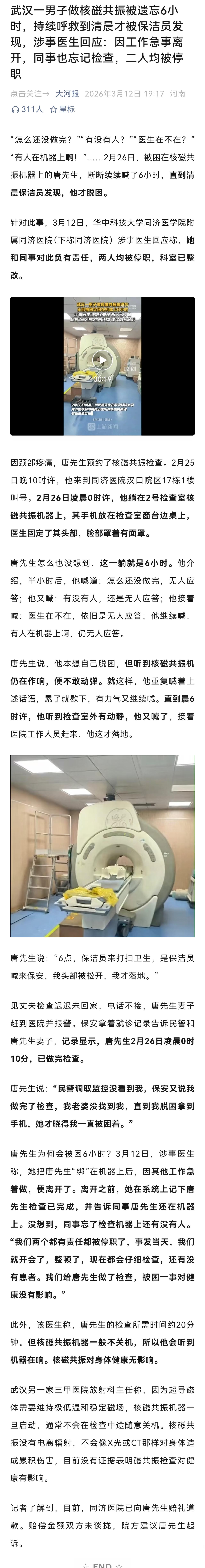 发生这样的事,令人匪夷所思。 据报道,涉事医生称,她把唐先生“绑”在机器上后,因其他工作急着做,便离开了。是什么急事让她急着连手上的事没有做完就离开? 有人说,这说明看病检查要有陪护的重要性。而医生要按规定诊疗流程完成检查不是基本规范吗? 医院赔偿是一方面,更需要反思为何会出如此低级的事故。