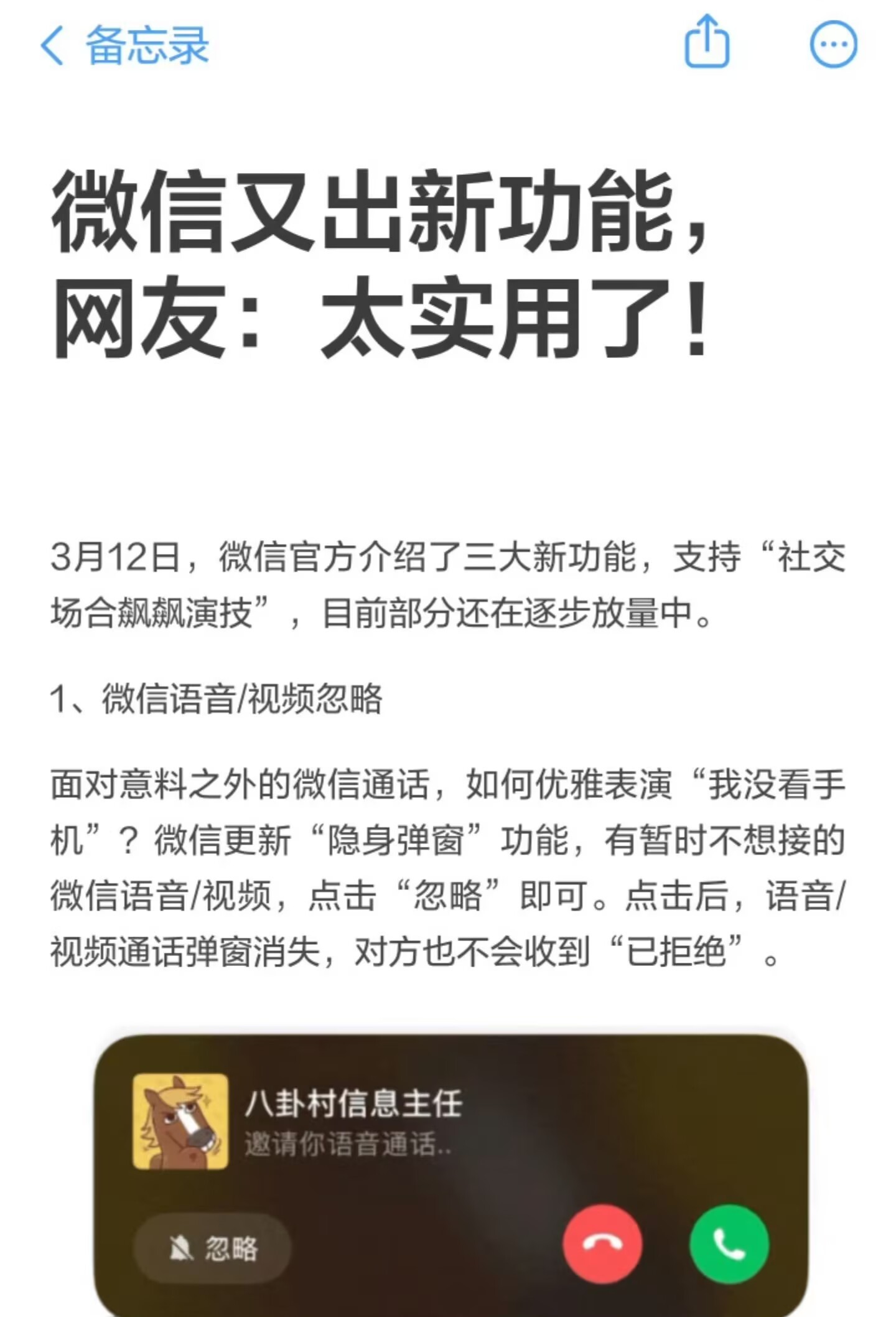 微信新功能被称为社恐福音 微信这次更新太懂社交尴尬了!不想接的语音视频能悄悄忽略,对方毫无察觉,再也不用硬接或找借口挂;语音还能自动翻外文,视频通话可锁屏防误触。这几个功能你们觉得哪个最实用?