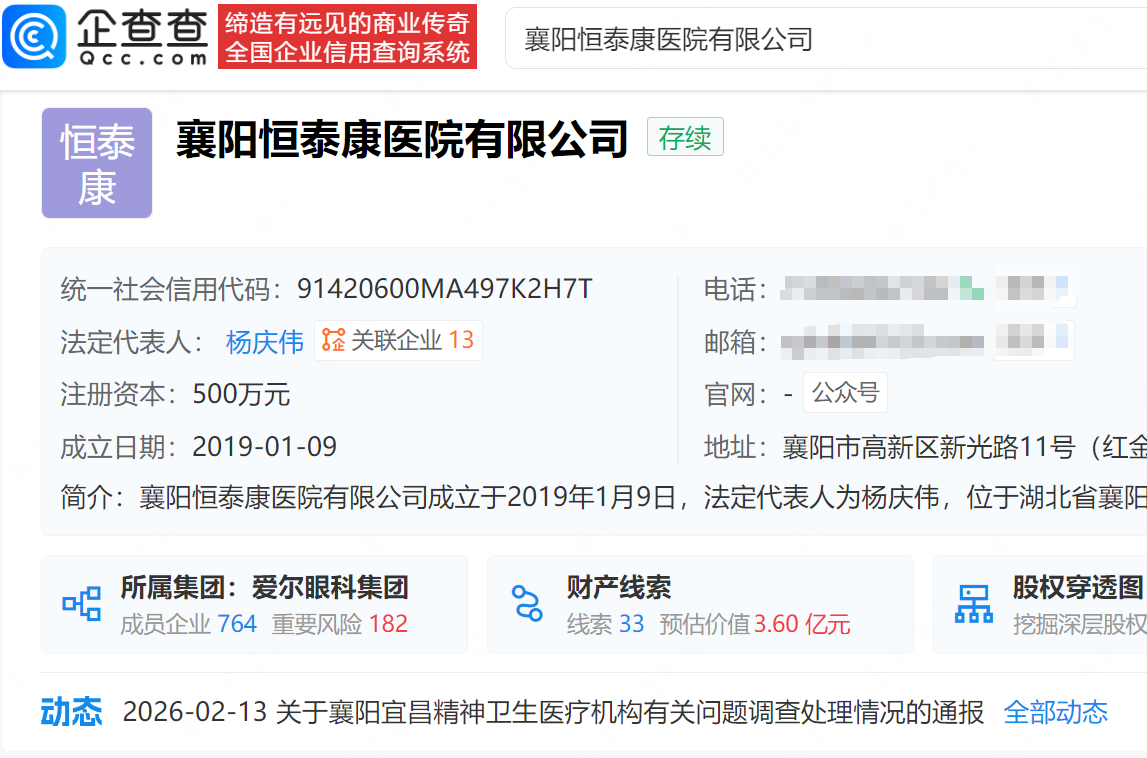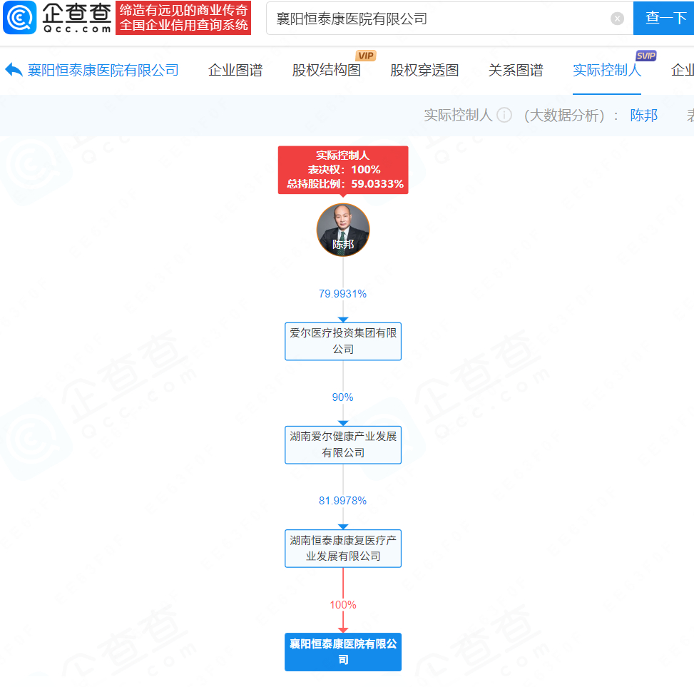 襄阳恒泰康医院有限公司成立于2019年1月,法定代表人杨庆伟,注册资本500万元,经营范围为精神科、预防保健科、医学检验科、医学影像科,由湖南恒泰康康复医疗产业发展有限公司全资持股。股权穿透显示,该院实控人为A股上市公司爱尔眼科董事长陈邦。