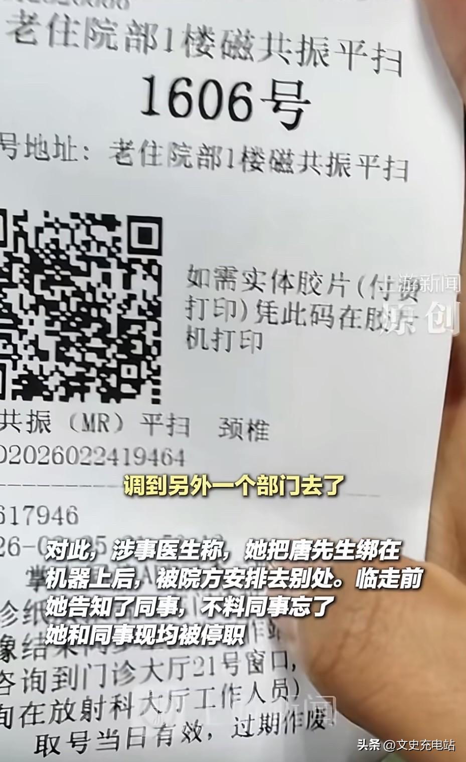 3月12日报道,湖北武汉一男子晚上10点去医院做核磁共振,凌晨12点,他躺到了机器上,医生固定了他的头部,并给他戴上面罩,半小时过去,男子发现还没结束,就喊道:有没有人?怎么还没结束?可无论他怎么喊,都没人回应他......[太阳] 那天清晨6点,武汉同济医院的保洁员推着清洁车走进核磁共振检查室,结果听到一阵断断续续的呼救声从机器方向传来。 走近一看,舱体里躺着一个人,头部被固定,身体几乎无法动弹。 这位姓唐的患者,已经在机器里困了整整6个小时,从前一天深夜0点被送进舱体,到次日清晨才被发现,他就这样度过了漫长的黑暗。 事情要从2月25日晚上说起,唐先生因颈部疼痛来到武汉同济医院汉口院区,挂的是核磁共振检查。 医院为他安排了2号检查室,操作医生按常规流程用胶带固定了他的头部,并为他戴上面罩。 通常情况下,这类检查在20分钟左右便可完成。 然而,半小时过去了,机器还在持续运行,没有任何医生来协助他离开设备,唐先生多次高声询问情况,但检查室内空无一人。 他曾尝试自行挣脱,但考虑到机器仍处于工作状态,担心动作幅度过大会干扰检查或损坏设备,最终选择继续等待。 这一等,从深夜等到了天亮。 事后,涉事医生坦承,她将唐先生固定妥当后,因临时处理其他紧急事项,独自离开了检查室。 离开前,她在医院系统中将该患者的状态错误标记为检查已完成,并口头叮嘱同事机器里还有人。 然而接班同事未前往现场确认,此后便将此事完全遗忘。 这一失误导致的后果环环相扣,唐先生的妻子因长时间无法联系到丈夫,赶到医院后选择报警,医院保安调取就诊记录后发现系统显示“患者已完成检查”,搜寻随即中断。 直到保洁员打扫时,才终于发现这名被遗忘在机器里的患者。 此时唐先生腿部已严重发软,几乎站立不稳,需要人搀扶才能离开检查室。 3月12日,涉事医生就此事作出回应,3月13日,武汉同济医院官方发布正式通报。 涉事医生表示,自己与同事对这次事故均负有直接责任,目前两人已被停职处理。 医院方面特别说明,核磁共振设备为维持超导状态通常保持持续运行,唐先生在舱内听到的持续轰鸣属于正常工况,且该检查方式不含电离辐射,不会对人体组织造成器质性损伤。 院方已当面向唐先生致歉,并安排了全面体检,结果显示身体功能无实质性损害。 核磁共振检查对不少人而言本身就不轻松,患者躺入狭窄舱体后,耳边持续响起的轰鸣最高可达110分贝以上,音量接近飞机螺旋桨声音,部分场景类似电钻近距离作业的水平。 这种封闭空间加上持续噪音的组合,容易引发焦虑,对有幽闭倾向的患者尤其如此。 唐先生在此状态下连续承受了6小时,生理上的静止与精神上的煎熬同时持续,其心理层面受到的冲击远比身体检查指标所能反映的更为复杂。 目前,涉事科室已召开流程整改会议,新规要求每台设备在检查开始前后均须由专人现场核查,确认舱内无滞留患者。 至于赔偿问题,双方目前尚未达成一致,院方建议唐先生通过司法途径处理。 医疗环境的工作强度客观存在,但操作规范的设计恰恰是为了在人员疲劳或注意力分散的情况下依然能拦截错误。 制度能否真正执行到位,才是这类事故是否会重演的关键所在。