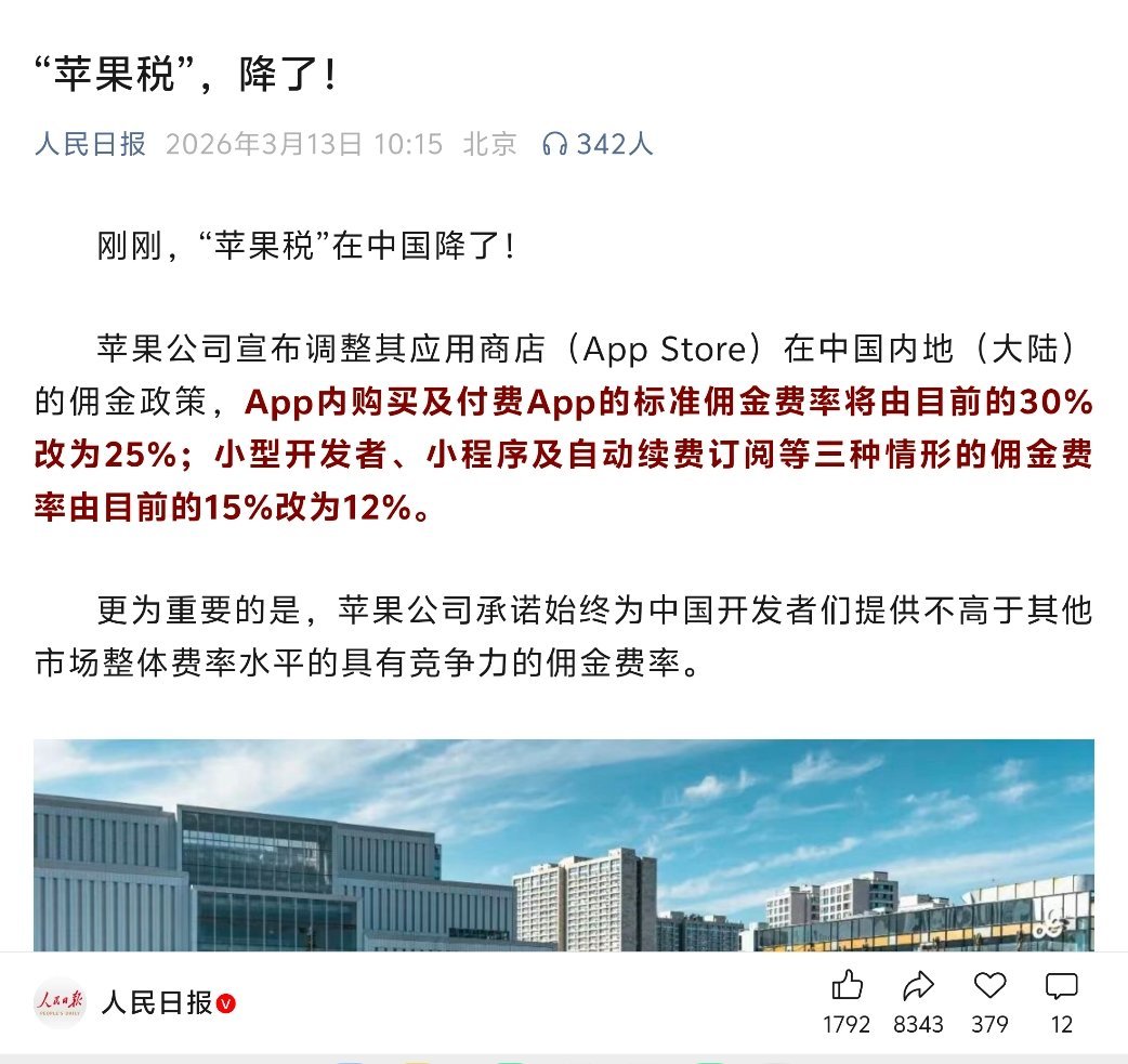 【苹果宣布降低应用商店(APP Store)抽佣金比例,利好苹果用户,促进开发者良性发展】3月13日,苹果官宣中国内地App Store佣金新政,3月15日生效:App内购买与付费App标准佣金由30%降至25%,小企业、小程序、自动续费订阅佣金由15%降至12%,系苹果入华最大幅度普惠式下调。此举是监管沟通与市场竞争共同推动的结果,标志着平台收费更趋公平透明。对开发者而言,直接降低运营成本,每年为国内超500万开发者减负超60亿元,中小开发者利润空间大幅提升,可将更多资金投入研发与创新,提升国内开发者国际竞争力。对用户而言,iOS端会员、游戏充值、直播打赏等溢价有望回落,2.7亿iOS用户直接受益,消费更划算。对行业而言,推动生态良性竞争,倒逼平台优化服务,促进移动互联网健康发展,实现平台、开发者、用户三方共赢。