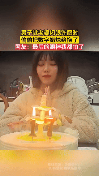 笑不活了,一男子给老婆过生日,老婆开心闭眼许愿时,他突然把数字蜡烛偷偷换了,老婆睁眼一看,那刀人的眼神瞬间藏不住了,网友:我看着也怕。 当天夫妻俩一起准备了生日蛋糕,老婆心里希望自己永远年轻,也为了图个开心,所以特意在蛋糕上插了17的数字蜡烛。 一切准备好之后,老婆就闭上眼睛,双手合十,认认真真开始许愿,没想到,她一旁的老公,趁她闭着眼睛,以迅雷不及掩耳之势,偷偷把蜡烛里的数字1给拔下来,换成了数字3。 等老婆许完愿,准备吹蜡烛的时候,一看蛋糕直接懵了:刚才还是17,现在居然变成37了!她当场瞅了老公一眼,那个眼神里全是“杀气”,老公见状,又怕却又忍不住想笑。 有网友调侃,别人老公都是往小了换,哄老婆开心,这位倒好,直接加20岁,纯纯找揍,老婆那眼神太真实了,感觉下一秒拳头就要上来了。 还有网友表示,建议老公今晚主动睡沙发,不然躲不过去,许愿刚结束,年龄却直接翻倍,老婆这愿望算是白许了。 普通的两口子互相逗乐、互相拆台,特别接地气,看似是捣乱,其实说明俩人关系特别好,开得起这种玩笑,相处起来轻松自在。 他们没有刻意秀恩爱,却也甜蜜治愈,平凡日子里的这种小打闹,正是婚姻里的乐趣所在,温馨又解压,看完心情都变好了。