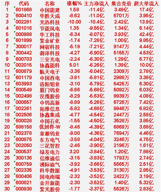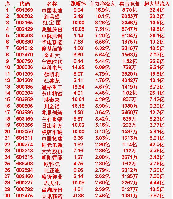 3月13日上午盘,主力趁低位,大幅买入的30名单 中国电建 涨幅9.94%,主力净流入16.9亿 新易盛 涨幅2.49%,主力净流入10.1亿 红宝丽 涨幅10.00%,主力净流入8.26亿 兆驰股份 涨幅10.05%,主力净流入7.31亿 中际旭创 涨幅1.14%,主力净流入7.20亿 3月13日中午收盘,主力资金“大幅卖出”的30名单: 中国能建 涨幅1.58%,主力净流入-11.4亿 华胜天成 涨幅-8.62%,主力净流入-11.0亿 光迅科技 涨幅-10.00%,主力净流入-10.4亿 节能风电 涨幅1.35%,主力净流入-9.55亿 华工科技 涨幅-6.34%,主力净流入-8.07亿