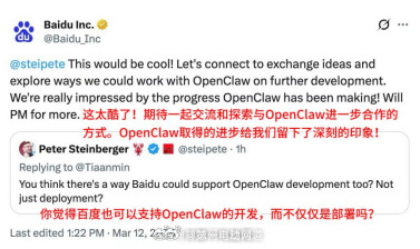 OpenClaw创始人赞中国AI创新速度惊人 OpenClaw 创始人 Peter Steinberger 在看到 Baidu 的手机端 AI Agent 应用后公开感叹:“中国 AI 创新速度 amazing。” ,实际上百度已经不是最快的了,此外腾讯、华为、小米以及豆包、KIMI、minimax等等这些大模型已经开始"全民养虾"
