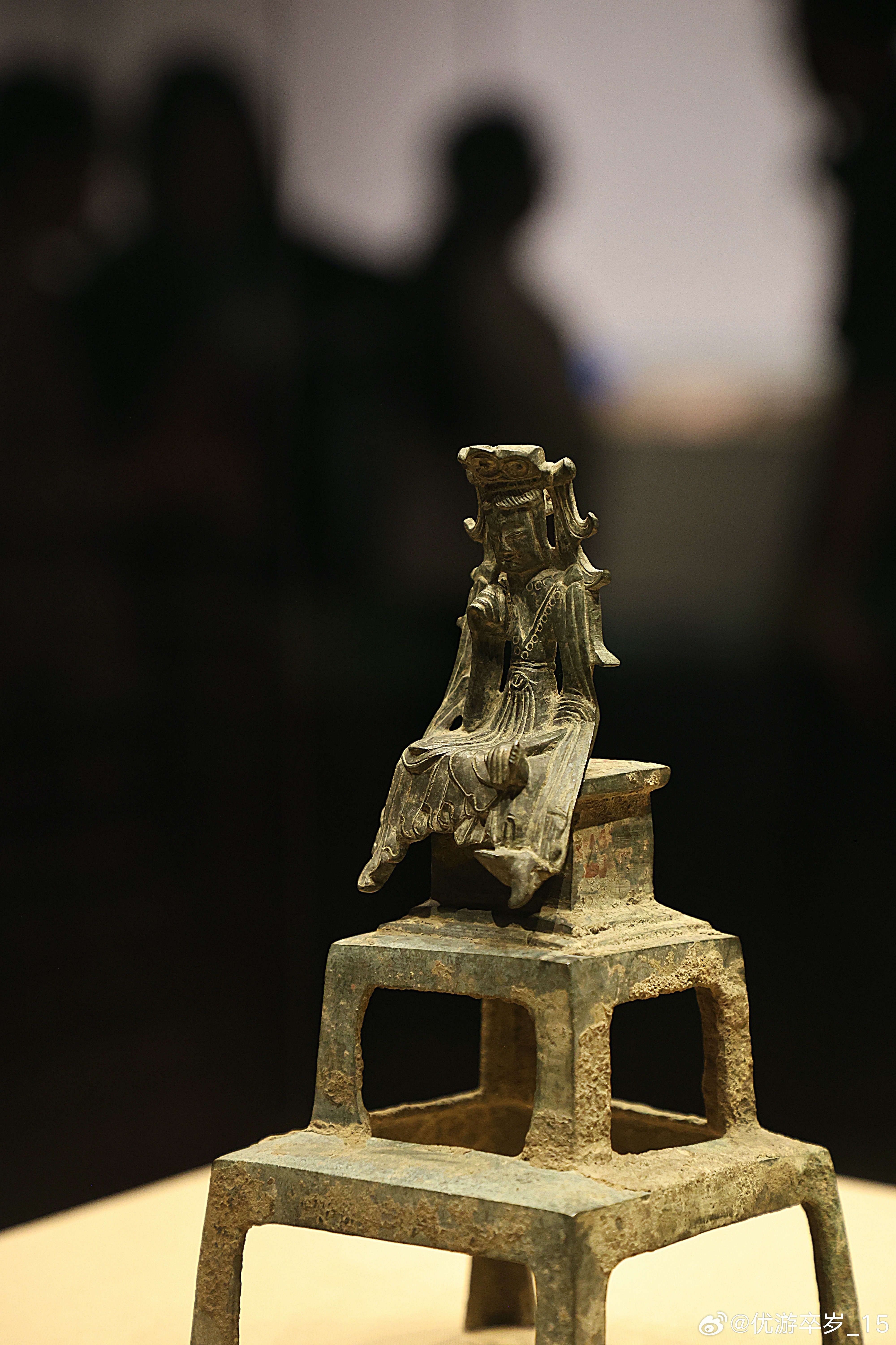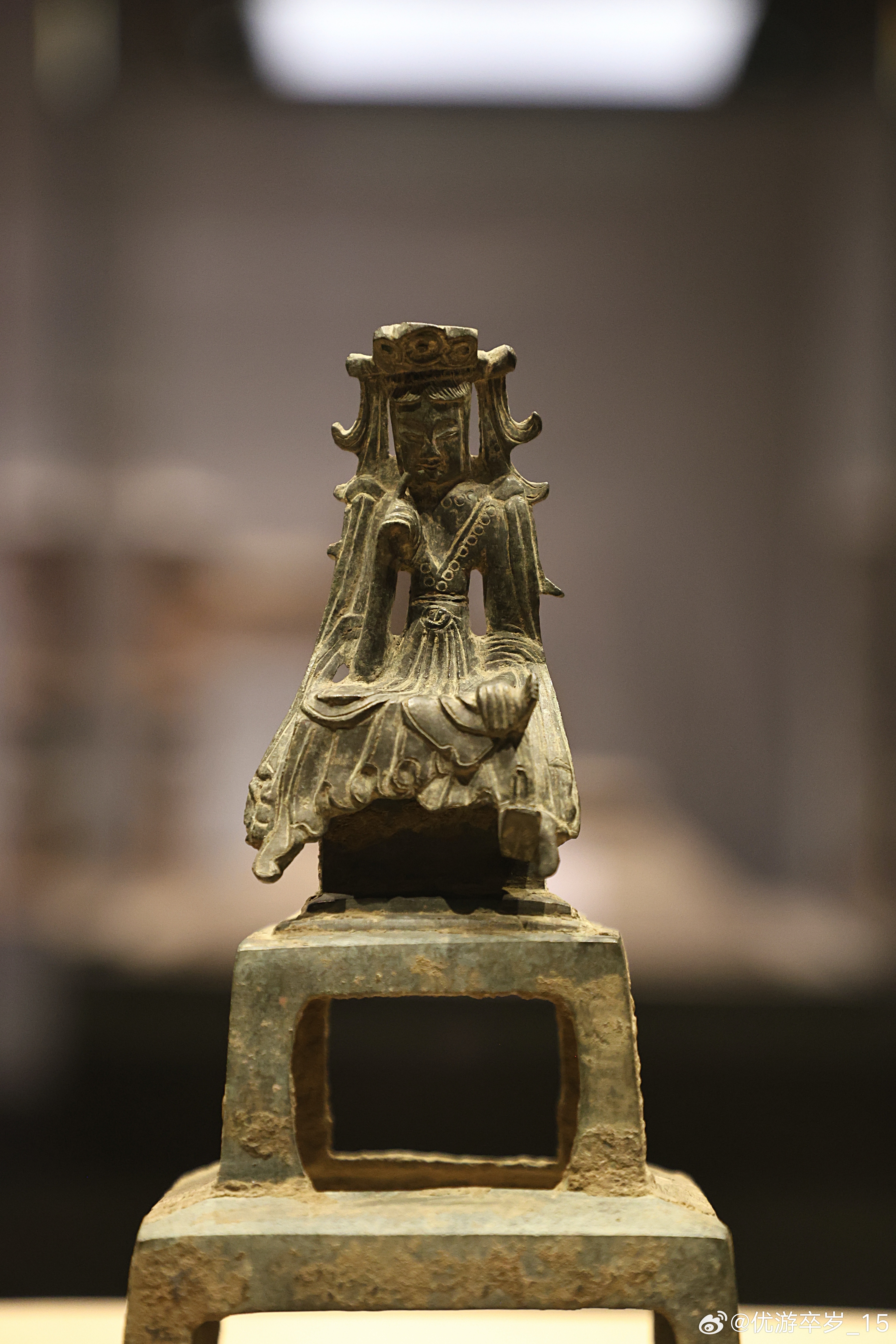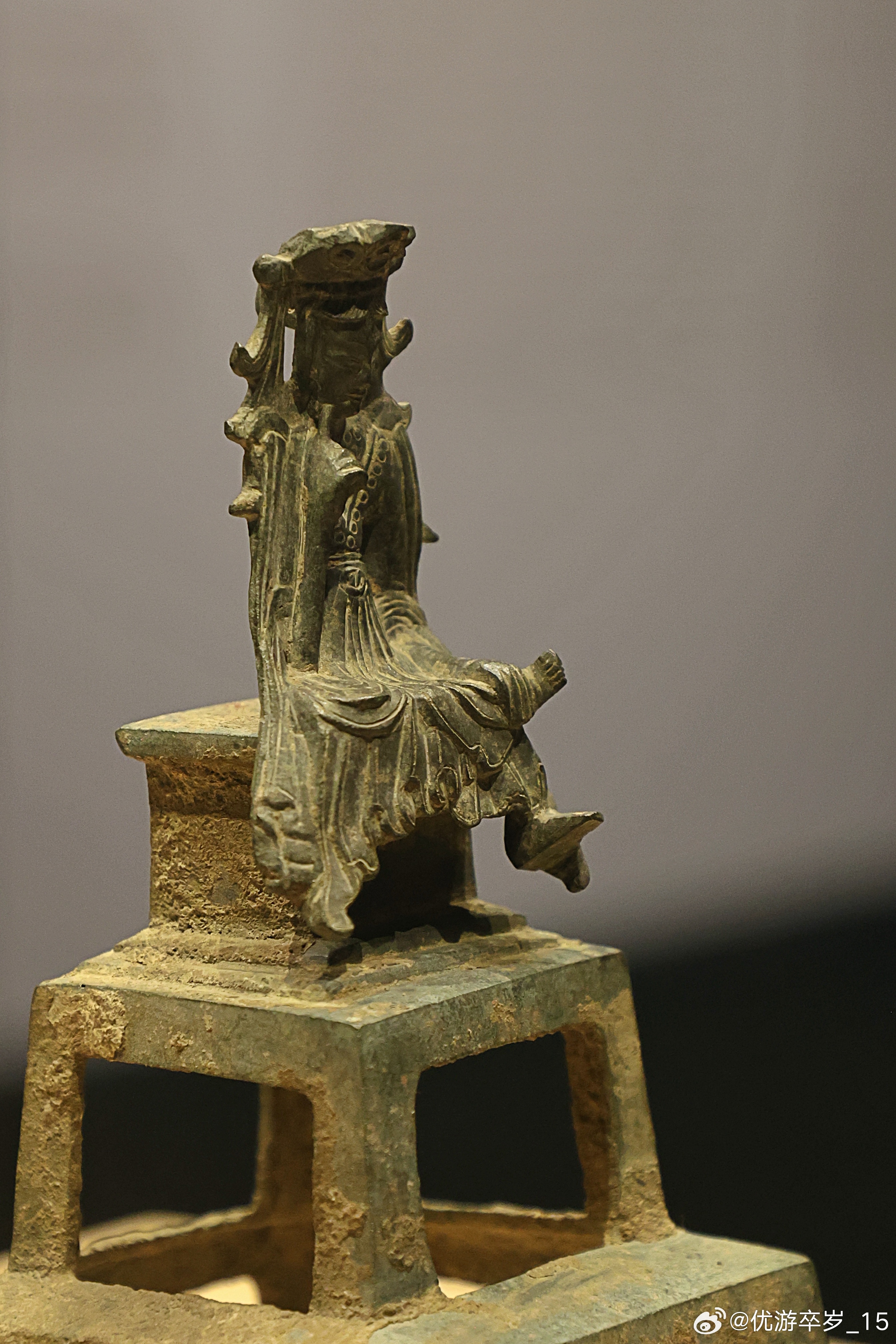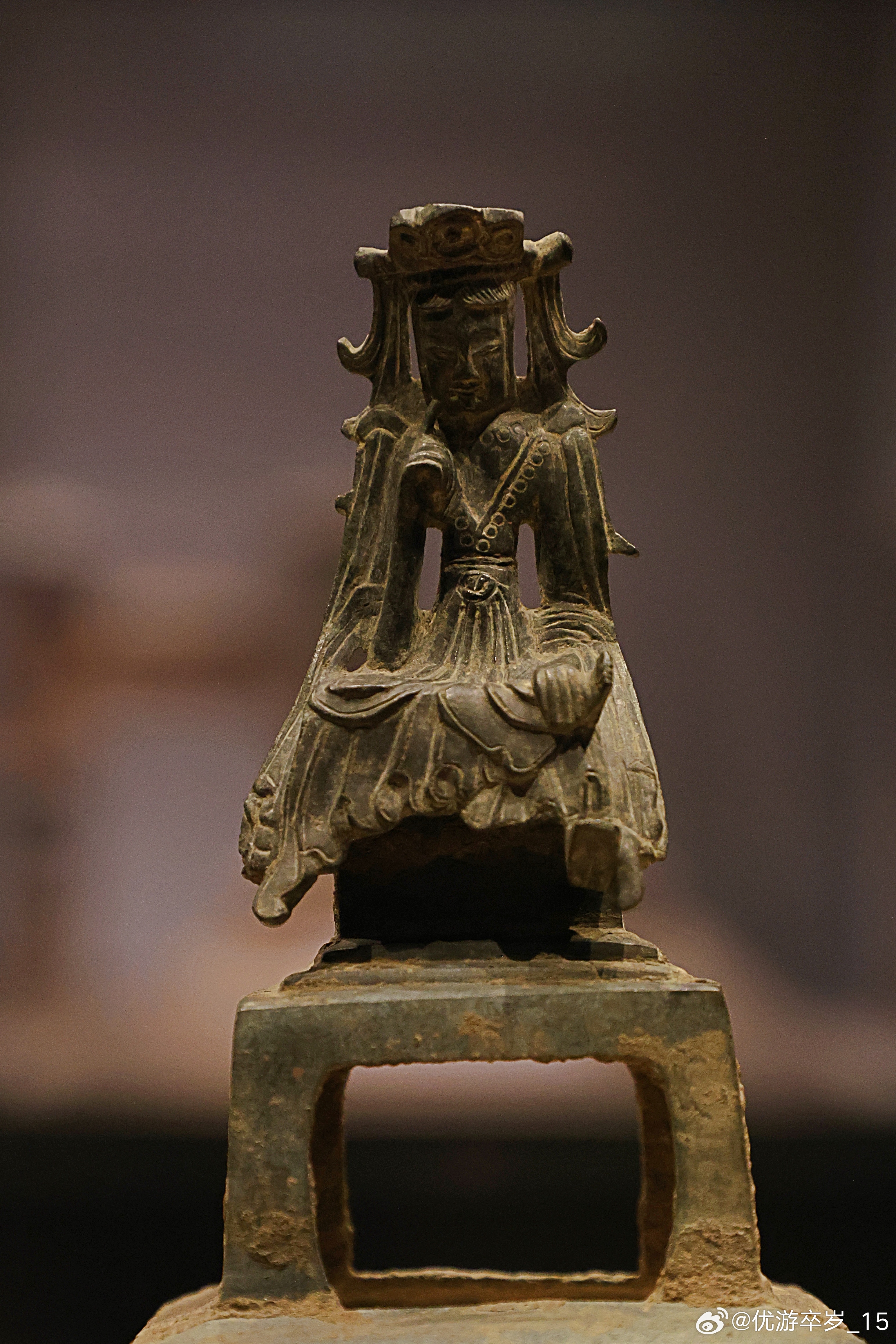 我的2026 【中国之中-中原古代文明精粹】 思惟菩萨铜像东魏(公元534-550年)郑州博物馆藏郑州自来水厂采集。“思惟像”是佛教造像中表现菩萨处于深沉思维、探索真理状态的特有姿态。这尊造像并不大,正处在北魏“秀骨清像”向隋唐丰满圆润风格的过渡期,即保留了前代的清隽风骨,又透露出此后造像更加人性化、内在化的趋势。清华大学艺术博物馆展出2026.2.8约会博物馆文物