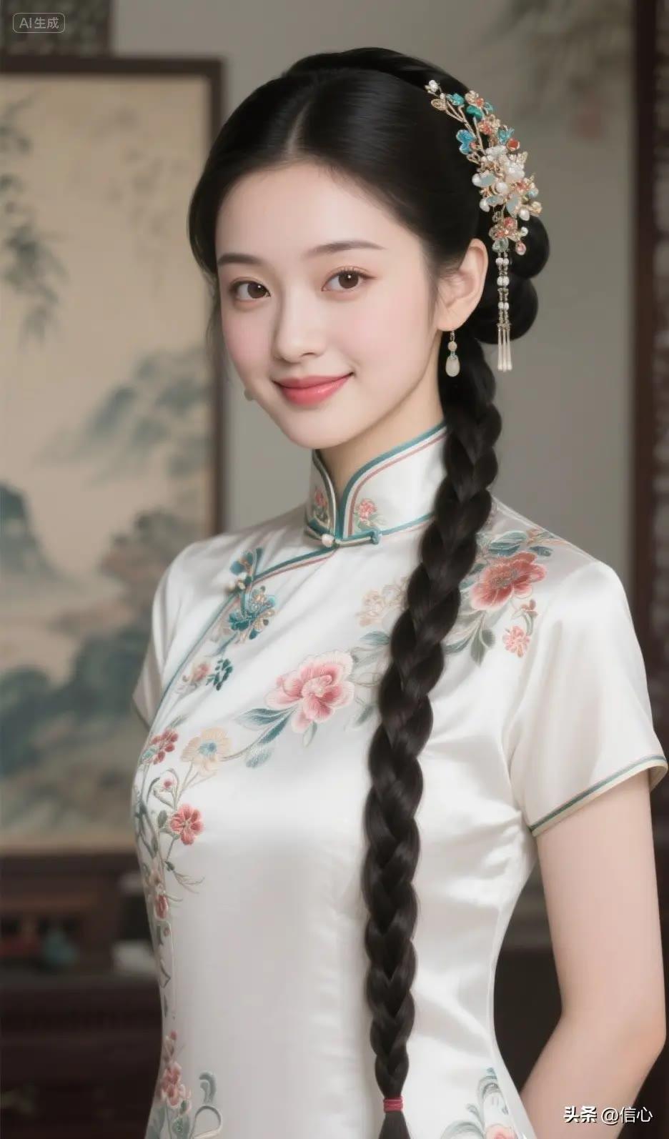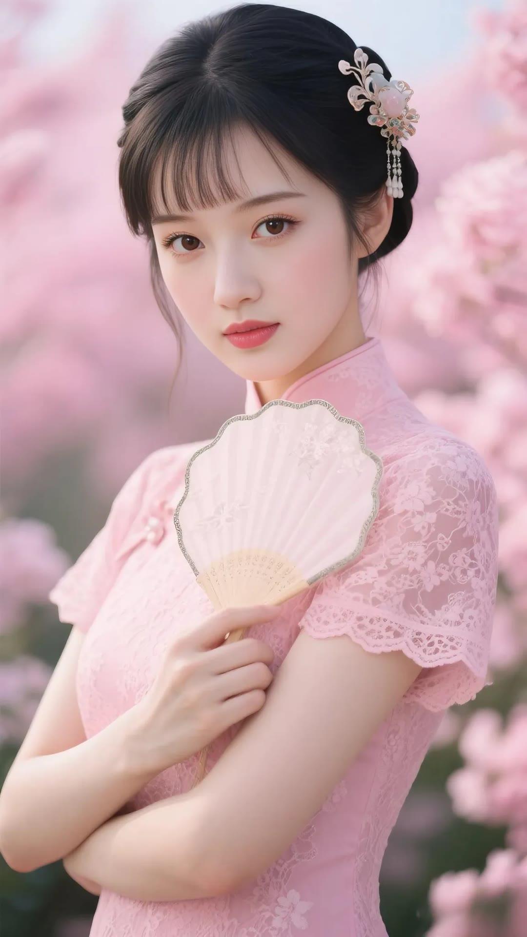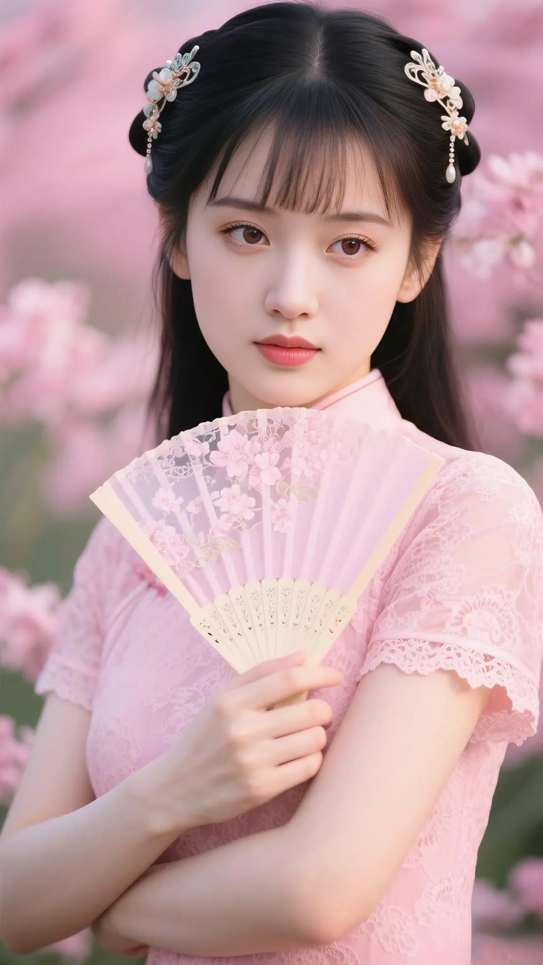 温柔古风少女,粉色花枝刺绣,长发编辫,古典优雅。
